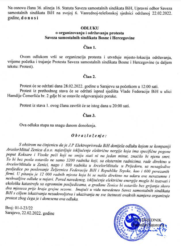 Upravni odbor Saveza samostalnih sindikata BiH donio je Odluku o organizovanju i održavanju protesta Saveza samostalnih sindikata BiH. Protest će se održati 28. februara 2022. godine (ponedjeljak) ispred sjedišta Vlade FBiH u Sarajevu.