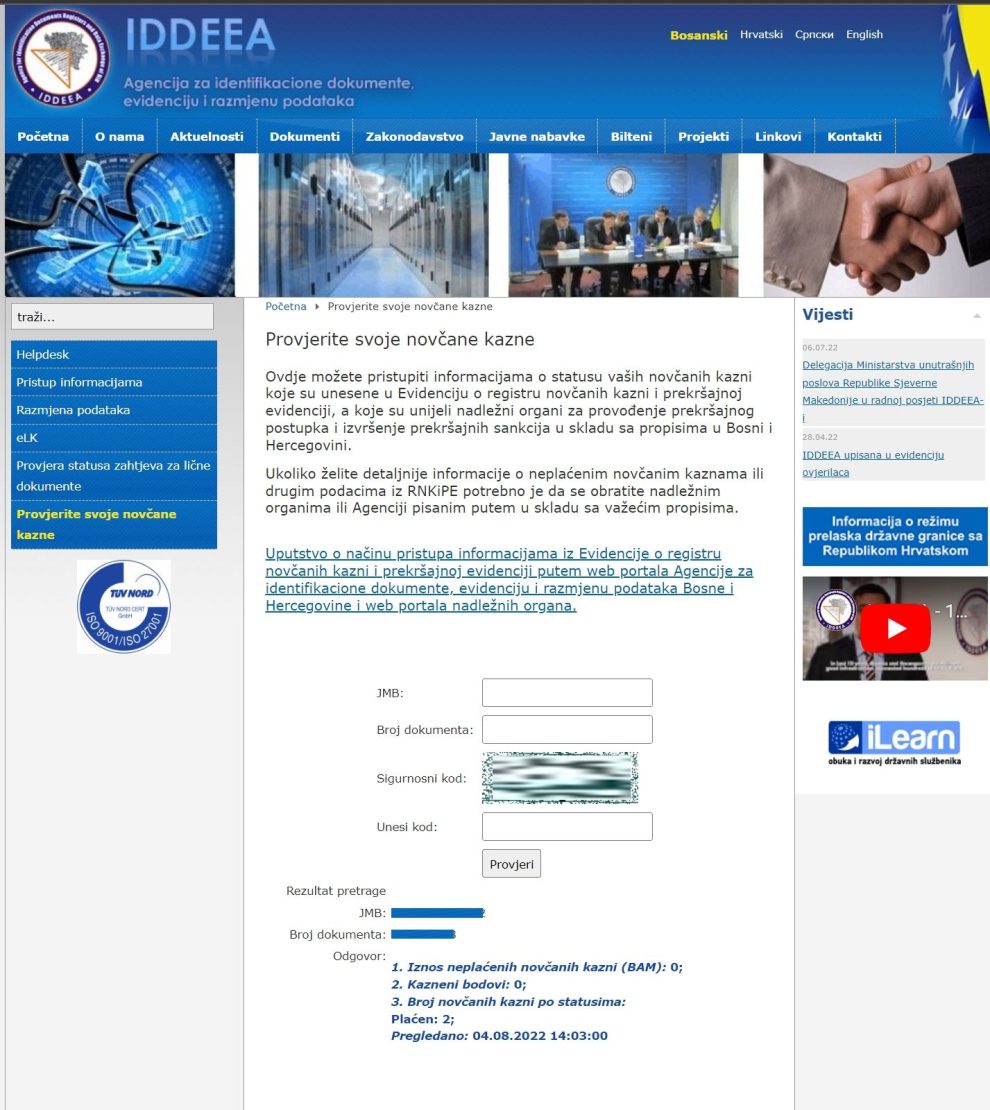 Na internet stranici Agencije za identifikacione dokumente, evidenciju i razmjenu podataka (IDDEEA) odnedavno građani mogu provjeriti da li imaju novčanih kazni za prekršaje u saobraćaju. Svi državljani BiH koji posjeduju važeću vozačku dozvolu na stranici mogu provjeriti da li imaju neplaćenih novčanih kazni u Evidencije o registru novčanih kazni i prekršaja, broj kaznenih bodova ali i status ukupnog broja plaćenih kazni, broja kazni koje su otišle u zastaru te prekoračenog vremenskog roka za plaćanje prekršajnih naloga.