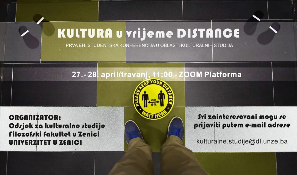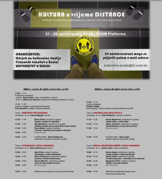 Prva bh. studentska konferencija u oblasti kulturalnih studija- Odsjek za kulturalne studije Filozofskog fakulteta Univerziteta u Zenici u utorak i srijedu, 27. i 28. aprila 2021. godine sa početkom u 11 sati organizira prvu bosanskohercegovačku online studentsku konferenciju pod nazivom “Kultura u vrijeme distance”. Na prvoj našoj konferenciji u oblasti kulturalnih studija, studentice i studenti će izlagati svoje radove u okviru četiri podteme: “Identiteti pod maskama”, “Distanca kao način života”, “Mediji i društvene mreže u doba pandemije” i “Studiranje u doba pandemije”.