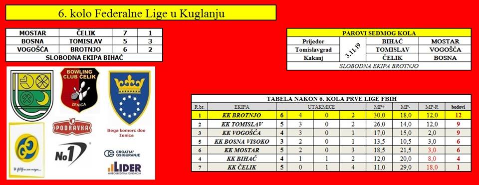 Prva Federalna Liga BiH u kuglanju ulazi u završnicu prvog, jesenjeg dijela. U susretima šestog kola postignuti su neki iznenađujući rezultati.