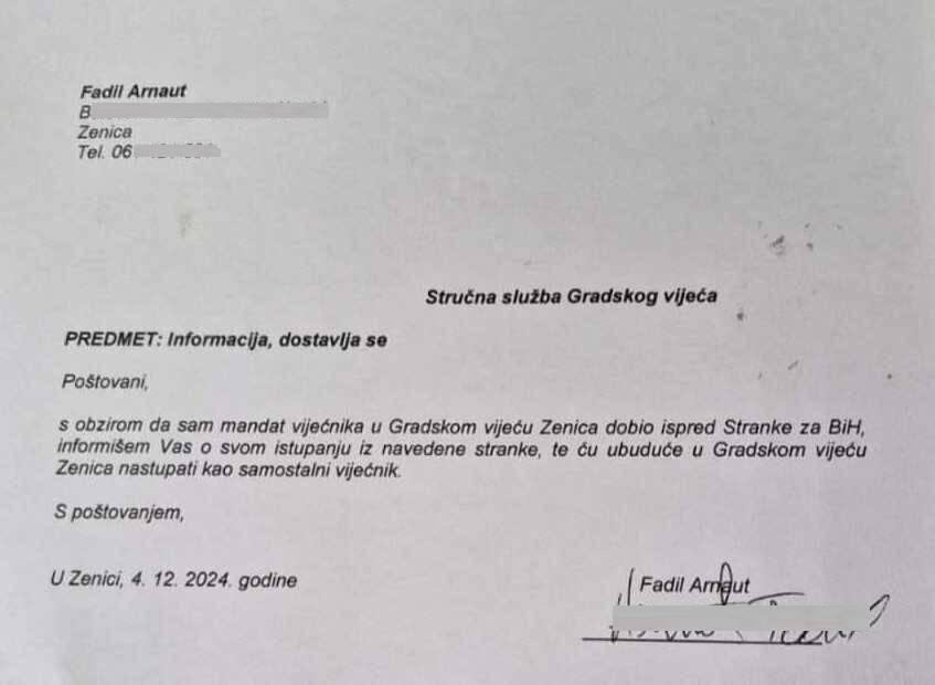 Fadil Arnaut, vijećnik Gradskog vijeća Zenica, istupio je iz Stranke za Bosnu i Hercegovinu. On je o tome obavijestio Stručne službe GV Zenica.