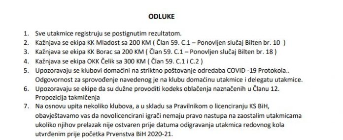 Najteže je prošla ekipa Mladosti iz Mrkonjić Grada koja će morati u kasu KS BiH uplatiti 925 KM. Po 400 KM platit će Čelik, Sloboda i Promo.