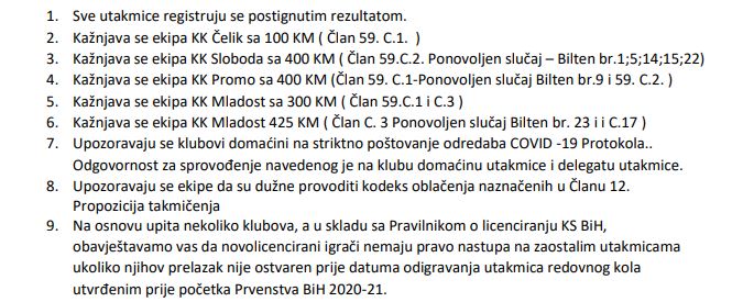 Pucaju kazne: Mladost 925 KM, Čelik, Sloboda i Promo po 400 KM- Nakon izvještaja delegata sa utakmica 23. i 24. kola Lige BiH te odigranih zaostalih utakmica komesar takmičenja Nadir Korežija je shodno pravilnicima odredio kazne za ekipe.