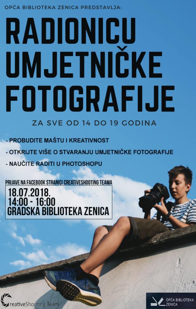 Radionica iz oblasti umjetničke fotografije i PhotoShopa – Od sljedeće sedmice “Ljeto u biblioteci” će biti bogatije za još jedan super interesantan i koristan program. Grupa edukovanih mladih ljudi iz Udruženja Kreativci i CreativeShooting Team-a organizuje Radionicu iz oblasti umjetničke fotografije i PhotoShopa, praćenu diskusijama o fotografijama i filmovima!