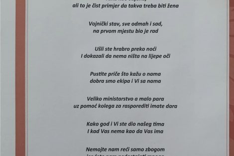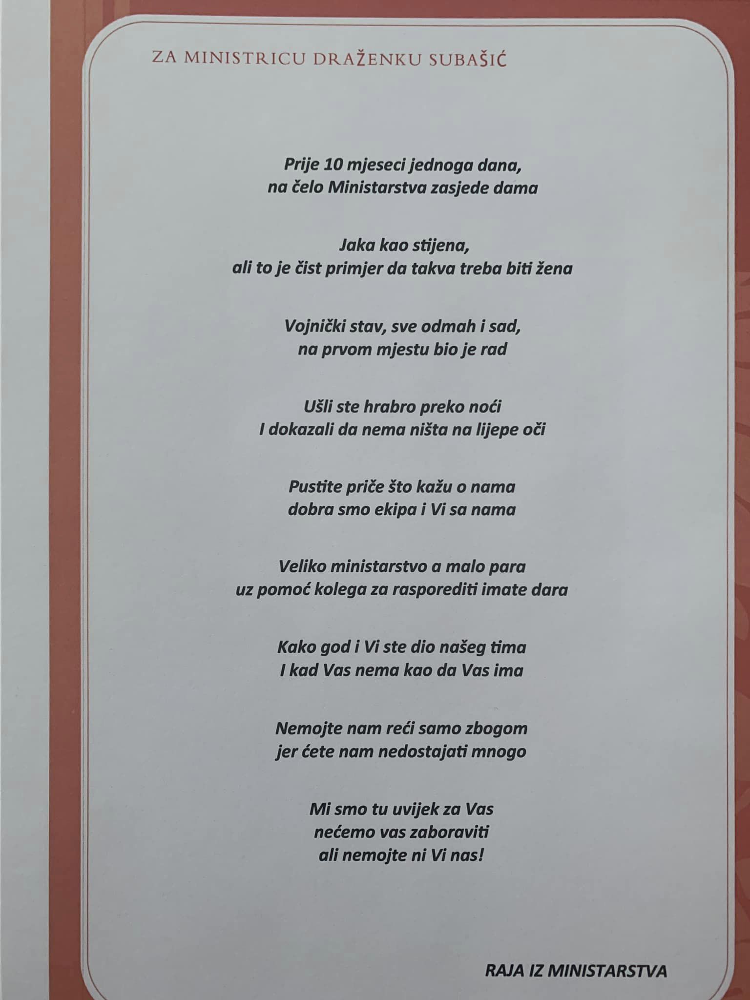 Zanimljivo je da je tom prilikom objavila i pjesmu koju su joj posvetili zaposlenici Ministarstva: