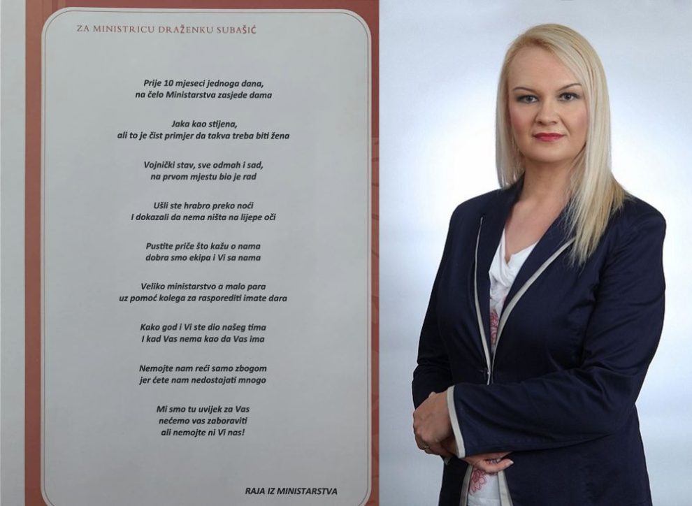 RAJA IZ MINISTARSTVA: Napisali pjesmu za odlazeću ministricu- Proteklih sedmica došlo je do promjene većine u Skupštini ZDK, te je izglasana smjena aktuelne Vlade Zeničko-dobojskog kantona i u narednim danima se očekuje imenovanje nove Vlade.