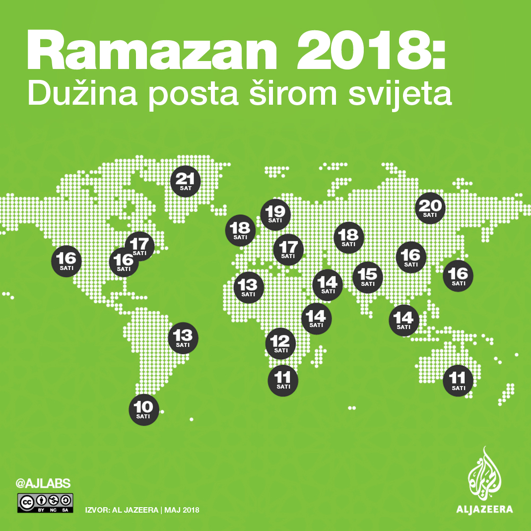 Ramazan 2018: Koliko poste muslimani širom svijeta – Posljednjih nekoliko godina ramazan je u proljetnim i ljetnim mjesecima, što znači duge i tople dane posta na sjevernoj hemisferi.