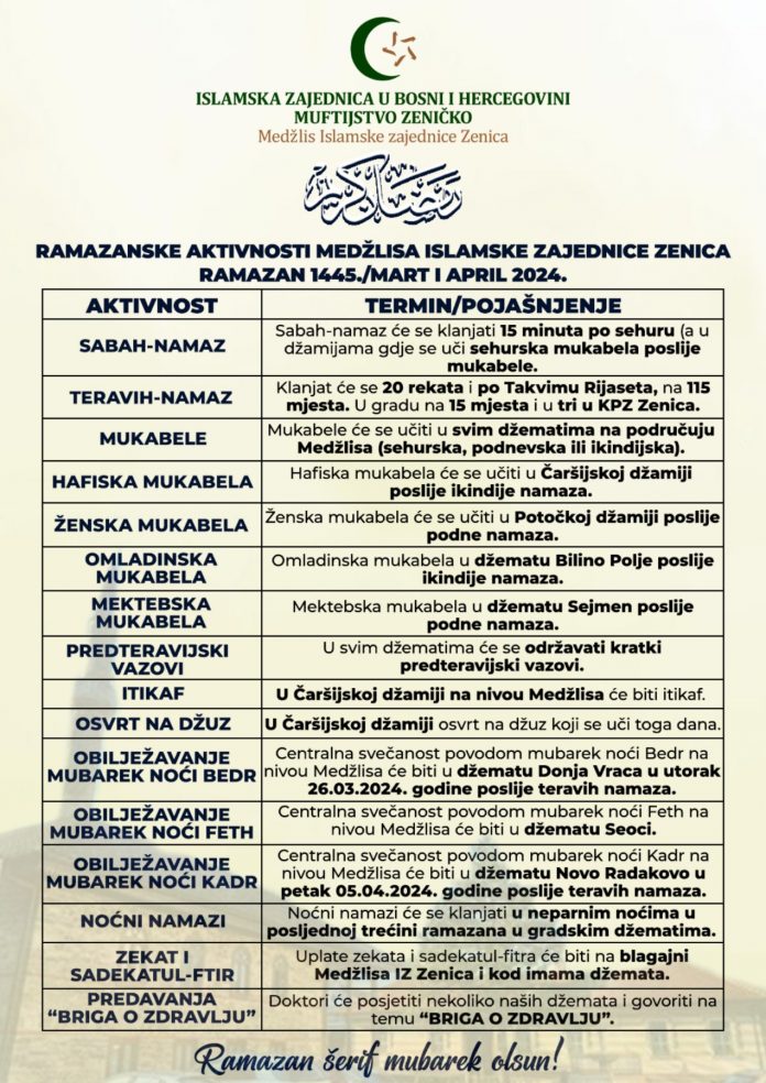 Ramazan 2024: Raspored Ramazanskih aktivnosti- U organizaciji Muftijstva zeničkog i Medžlisa Islamske zajednice Zenica i u ovom ramazanu su planirane aktivnosti koje će obogatiti sadržaj tokom ovog mjeseca.
