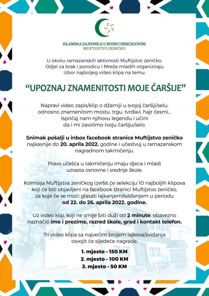 Snimak pošalji u inbox facebook stranice Muftijstvo zeničko najkasnije do 20. aprila 2022. godine i učestvuj u ramazanskom nagradnom takmičenju.