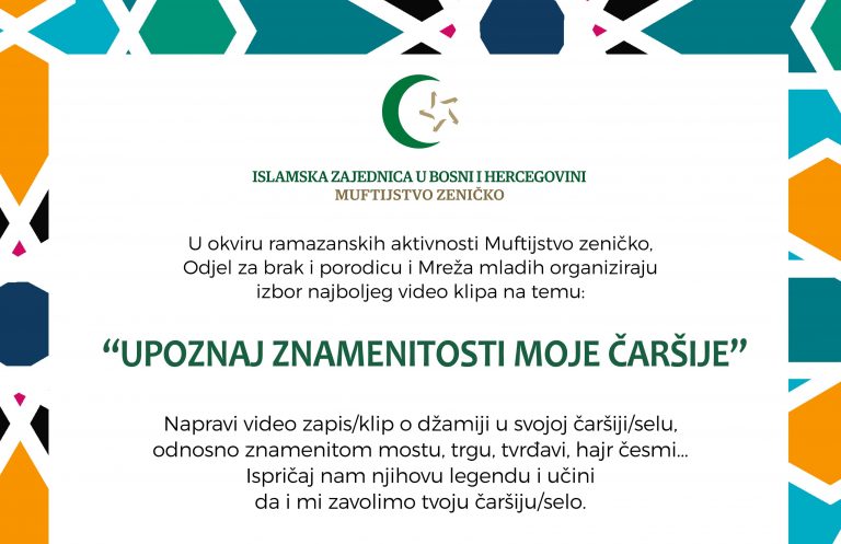 U okviru ramazanskih aktivnosti Muftijstvo zeničko, Odjel za brak i porodicu i Mreža mladih organiziraju izbor najboljeg video klipa na temu: