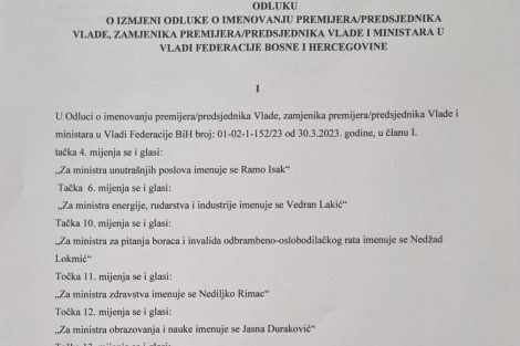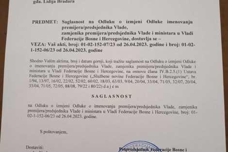 Predsjednica entiteta F BiH Lidija Bradara uputila je dopis u kojem obavještava Predstavnički dom Parlamenta F BiH da je došlo do promjena u sastavu predloženih kandidata za ministre.