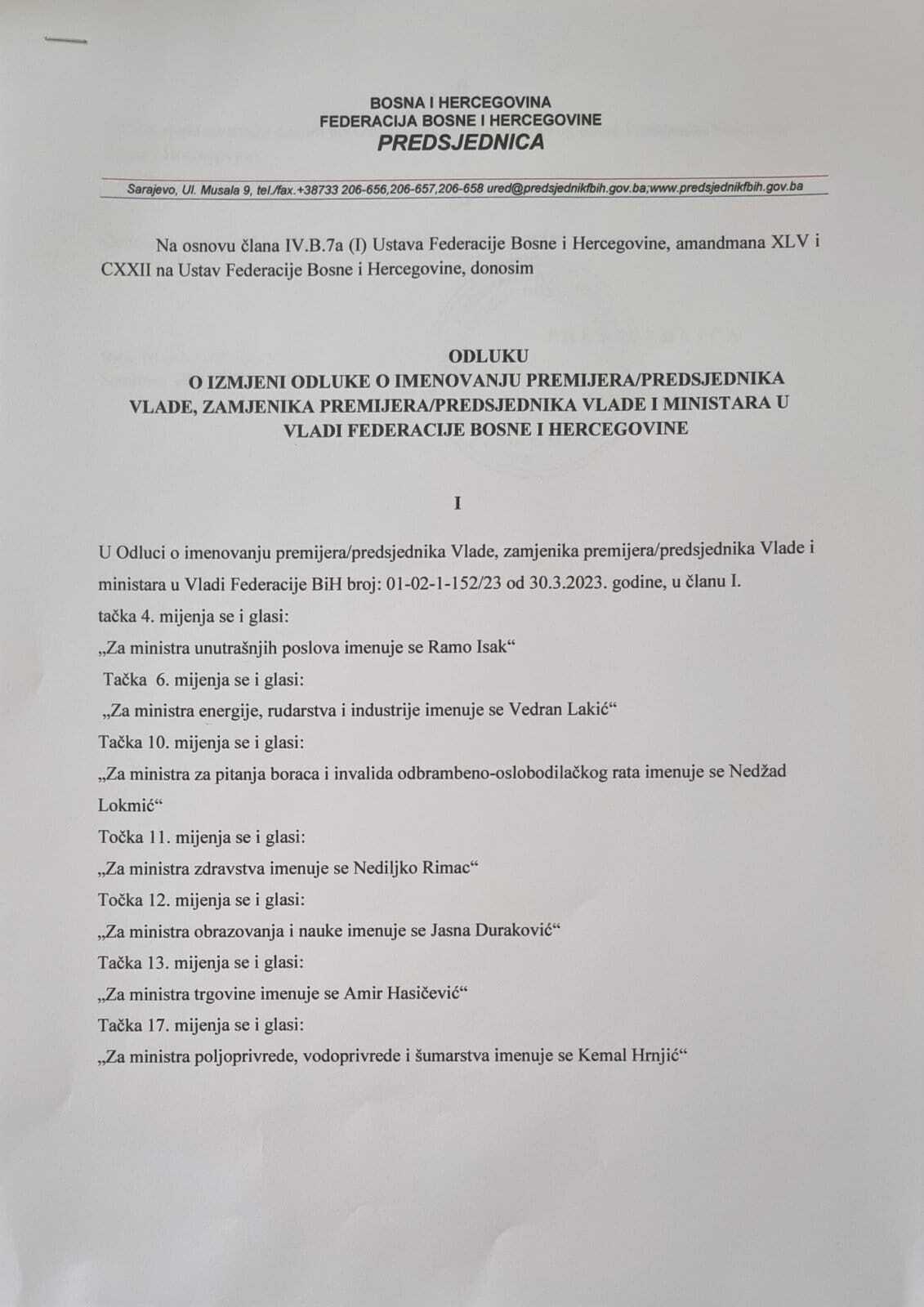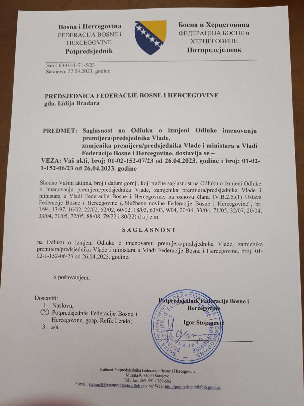 Predsjednica entiteta F BiH Lidija Bradara uputila je dopis u kojem obavještava Predstavnički dom Parlamenta F BiH da je došlo do promjena u sastavu predloženih kandidata za ministre.
