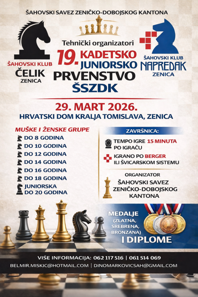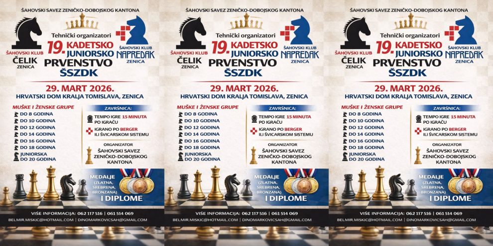 19. kadetsko i juniorsko prvenstvo Šahovskog saveza Zeničko-dobojskog kantona održat će se dana 29.03.2026. godine u Hrvatskom domu Kralja Tomislava u Zenici (adresa: Dr. Abdulaziza Aska Borića, Zenica 72000), sa početkom u 11:00 sati.