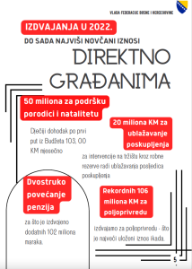 Kako se navodi u publikaciji, u periodu 2015-2022. godine, u skladu sa zakonima i odlukama federalna ministarstva su izvršila brojne transfere građanima, privatnim i javnim preduzećima, obrtnicima, nevladinim organizacijama, penzionerima, invalidima, pojedincima u stanju socijalne potrebe, vrhunskim sportistima, povratnicima i drugima.