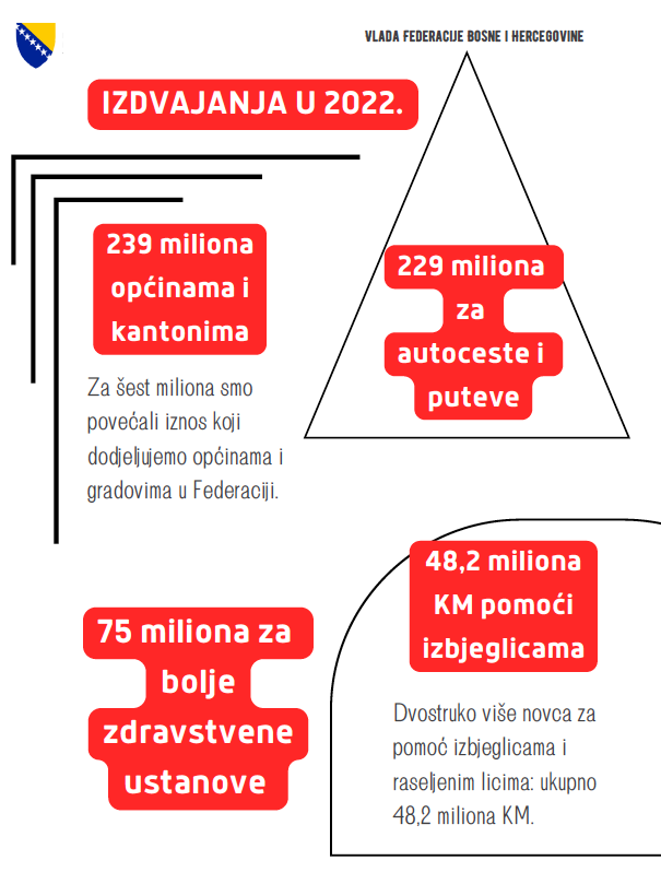 229 miliona KM je potrošeno za autoceste i puteve, 75 miliona KM za bolje zdravstvene ustanove, te 48,2 miliona KM za pomoć izbjeglicama.