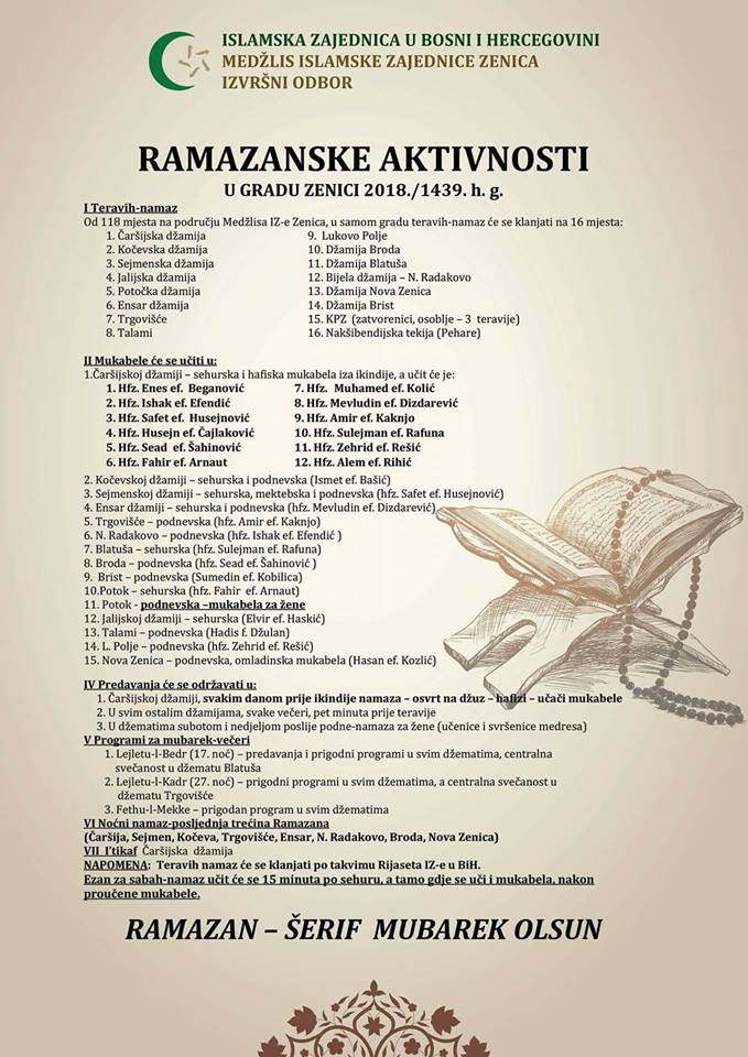 Raspored RAMAZANSKIH AKTIVNOSTI u gradu Zenici 2018 – Izvršni odbor Medžlisa Islamske zajednice Zenica uradio je Raspored RAMAZANSKIH AKTIVNOSTI u gradu Zenici 2018.godini /1439. hidžretskoj godini.