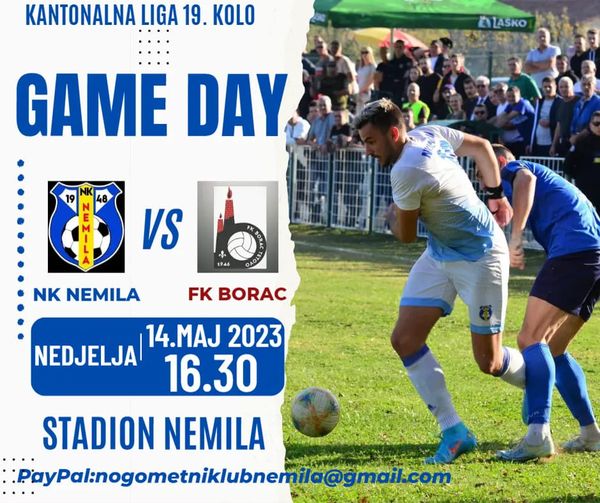 16,30 sati, Nemila: NK Nemila – FK Borac Tetovo (Kantonalna liga ZDK, 19.kolo, stadion Nemila);