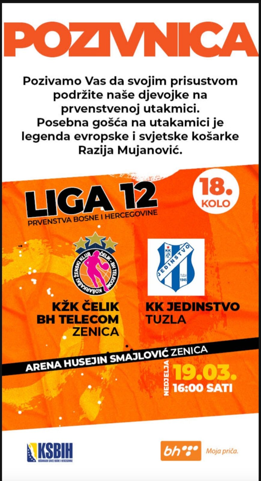 16 sati, Zenica: KŽK Čelik BH Telecom – KK Jedinstvo Dženex (bh.košarkaška liga za žene 18.kolo, gradska Arena „Husejin Smajlović).
