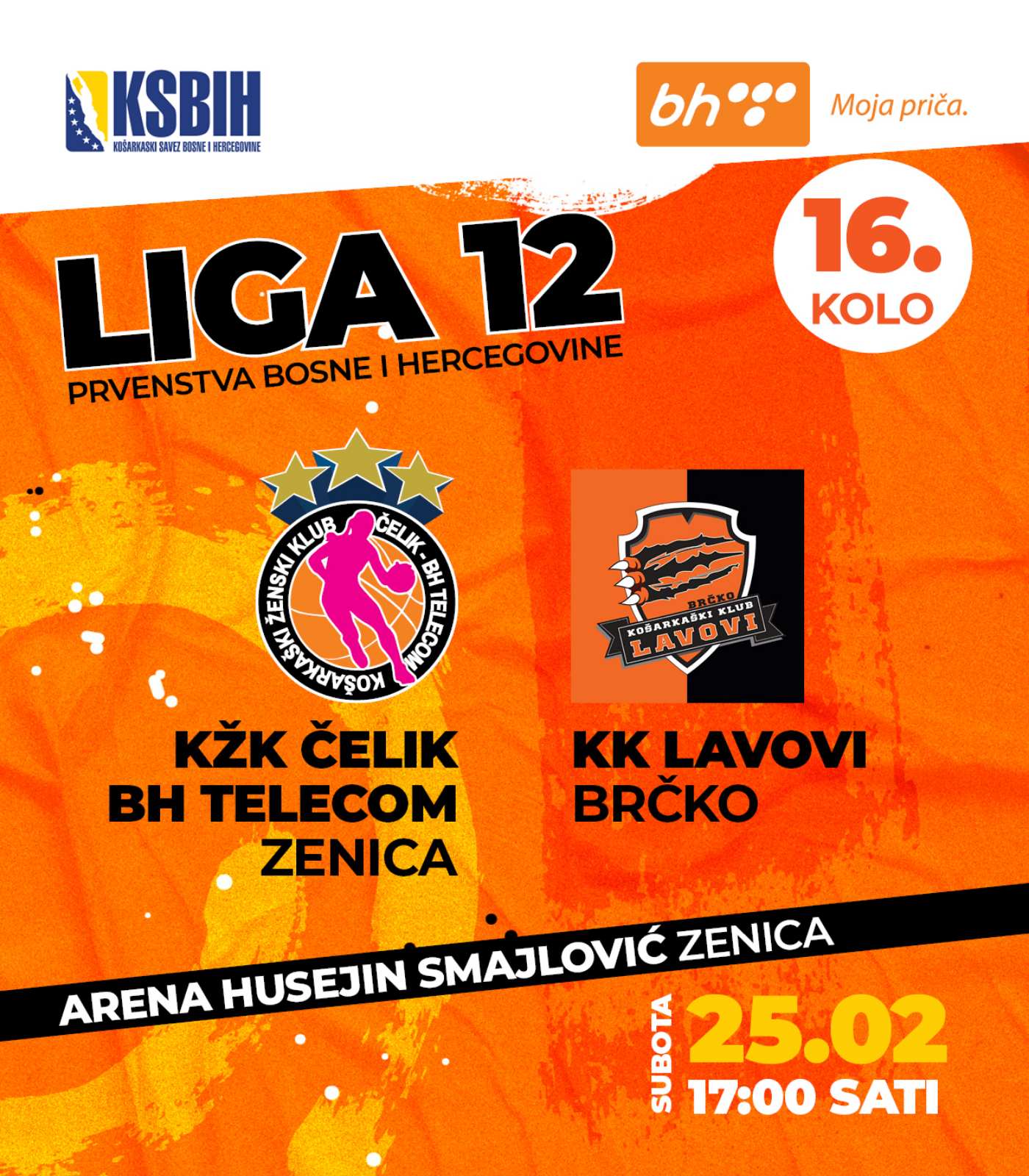 17 sati, Zenica: KŽK Čelik BH Telecom–ŽKK Lavovi (bh.košarkaška liga za žene 16.kolo, zenička Arena);
