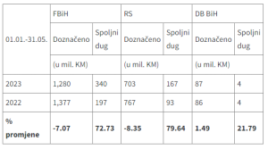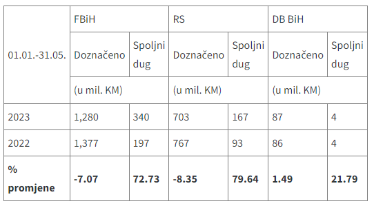 U tablici ispod dajemo prikaz ukupno raspoređenih sredstava entitetima i Distriktu Brčko BiH sa pripadajućim vanjskim dugom za prvih pet mjeseci 2023. godine u poređenju sa istim periodom 2022. godine. Iako je UIO prikupila više sredstava od indirektnih poreza u toku 2023. godine entiteti su dobili manje prihoda u konačnoj raspodjeli zbog činjenica da je vanjski dug entiteta znatno veći u ovoj godini u odnosu na 2022. godinu. Iznosi za otplatu vanjskog duga se odbijaju prije raspodjele prihoda korisnicima. Svi iznosi su iskazani u milionima KM.