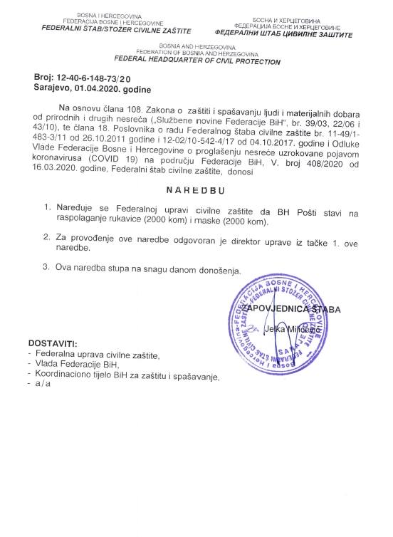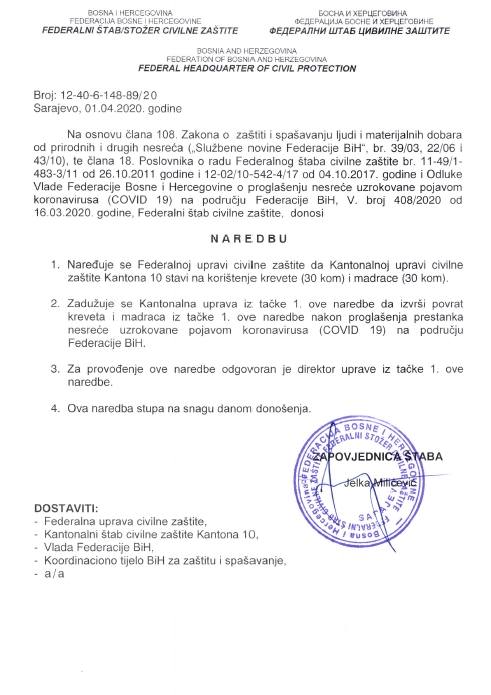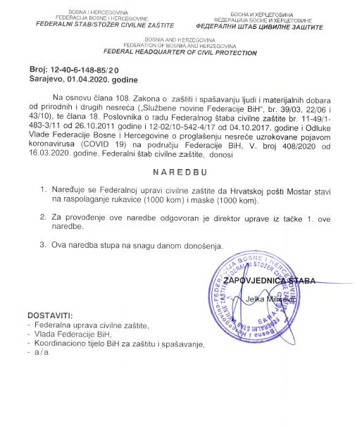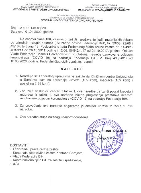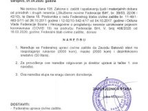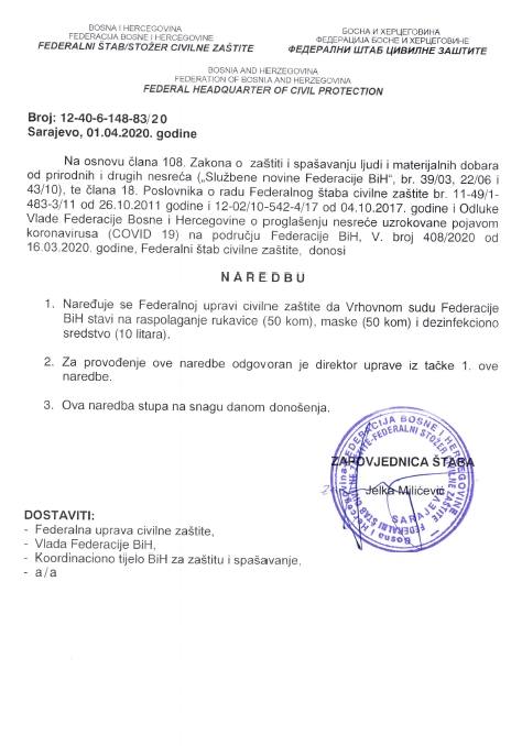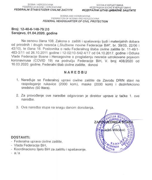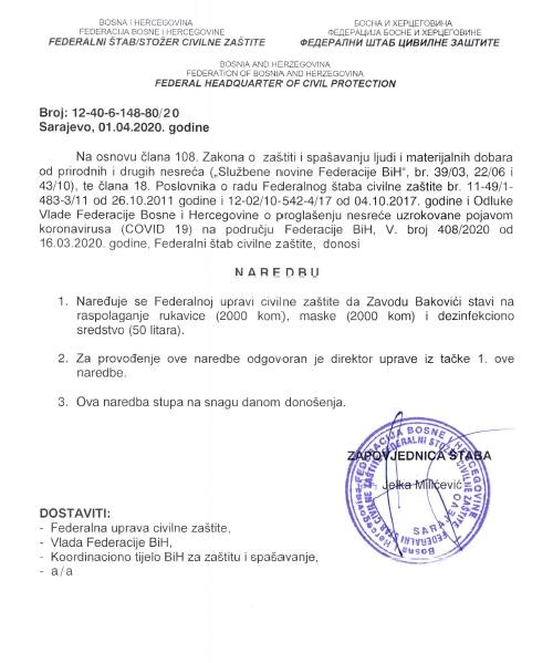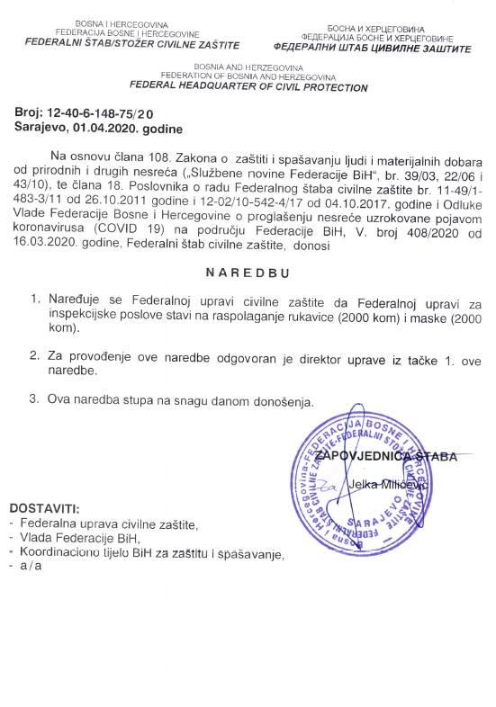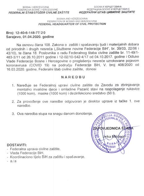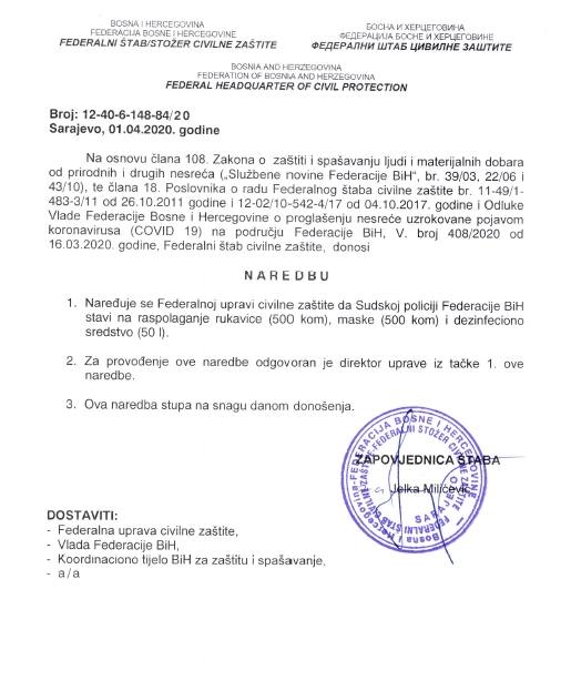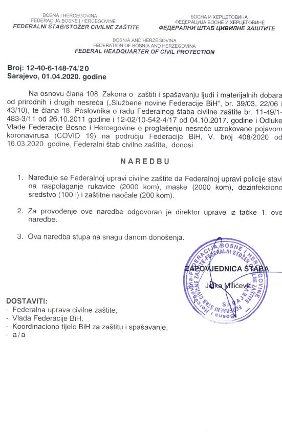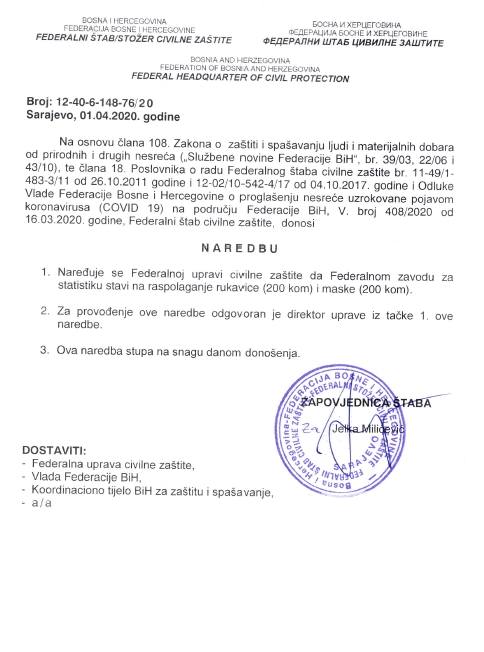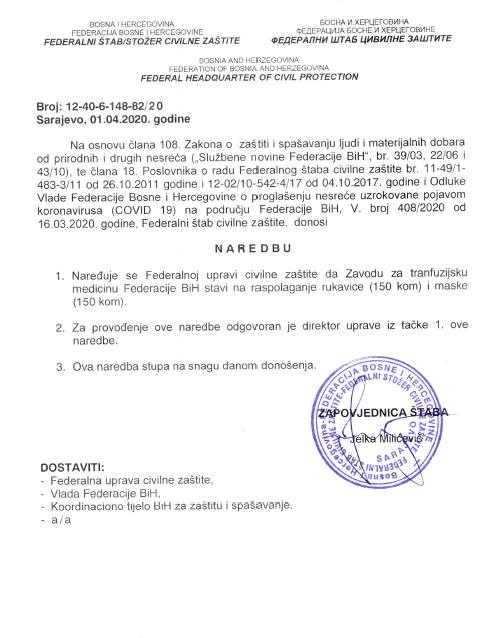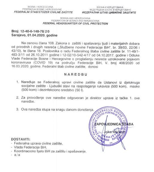 S ciljem sprečavanja širenja zaraze korona virusa (Covid-19) na području Federacije  Bosne i Hercegovine (FBiH) u Sarajevu je juče (1. april) održana 12. vanredna sjednica i 3. hitna vanredna elektronska sjednica Federalnog štaba civilne zaštite (FŠCZ) kojim je predsjedavala zapovjednica Jelka Milićević.