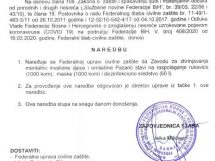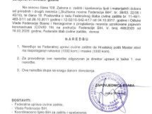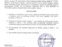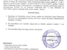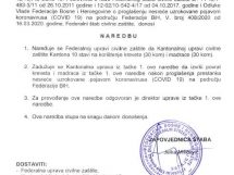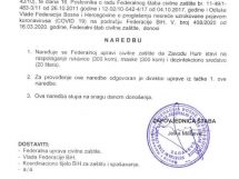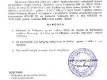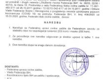 Razmatra se izmjena zabrane kretanja mlađim od 18 i starijim od 65, doneseno i novih 17 naredbi – Na jučerašnjoj 12. vanrednoj sjednici FŠCZ je upoznat sa Informacijom o poduzetim aktivnostima kantonalnih, općinskih i gradskih štabova civilne zaštite na iznalaženju adekvatnog prostora za smještaj i izolaciju lica za koja se utvrdi da ne poštuju mjere izolacije izrečene od nadležnih organa u skladu sa Preporukom od 24.3.2020 godine.