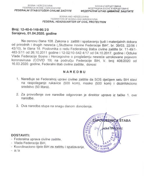 Na 3. hitnoj vanrednoj elektronskoj sjednici FŠCZ, na osnovu zaključka sa 12. vanredne sjednice FŠCZ, donijeto je 17 novih naredbi koje se tiču nabavke neophodne zaštitne opreme i sredstava (rukavice, maske, dezinfekciona sredstva, zaštitne naočale) i kreveta sa madracima za Klinički centar Univerziteta u Sarajevu (KCUS) i još 16 vladinih organizacija, uprava, institucija, zavoda i drugih pravnih lica koja su od izuzetne važnosti za funkconiranje sistema zaštite i spašavanja ljudi i materijalnih dobara u zaustavljanju širenja pandemije uzrokovane pojavom korona virusa (Covid – 19) na području FBiH.