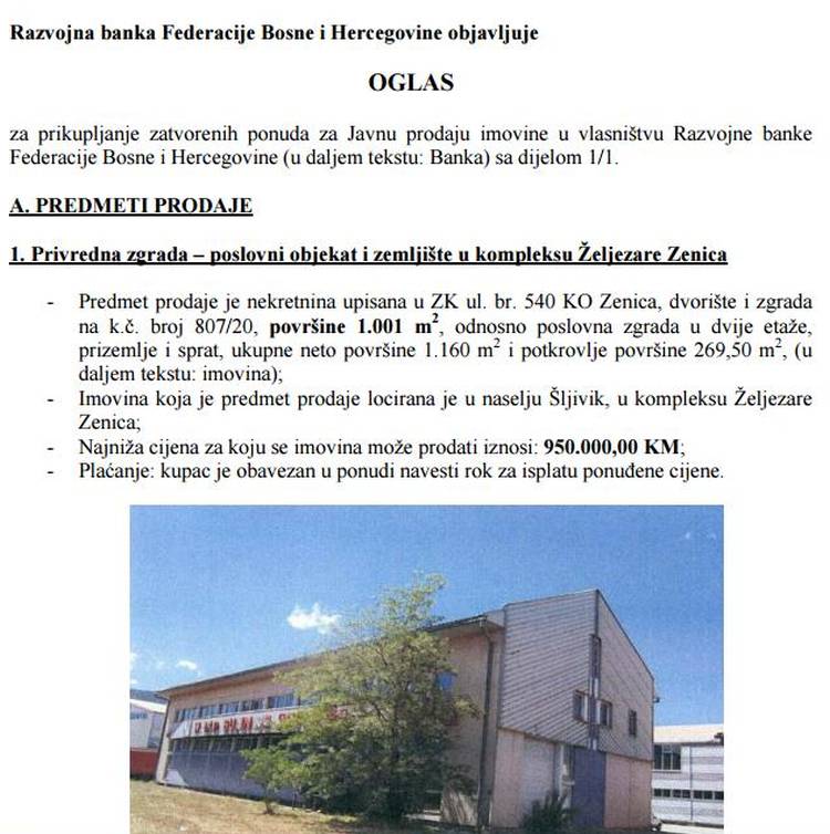 Razvojna banka prodaje Željezarinu halu i zemljište za 950 hiljada KM – Razvojna banka Federacije Bosne i Hercegovine objavila je oglas za prodaju svoje imovine, a riječ je o privrednoj zgradi u kompleksu Željezare Zenica.