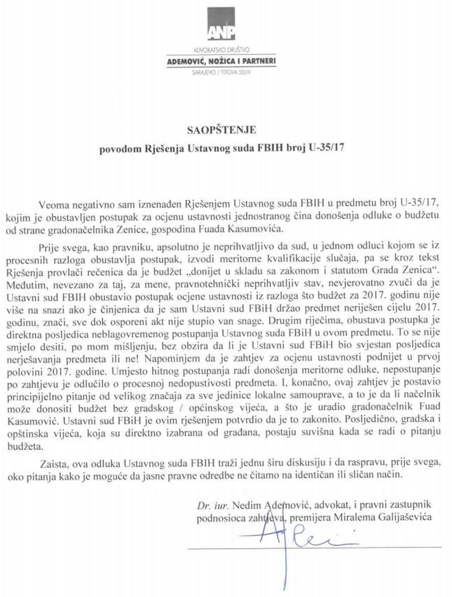 Reagiranje advokata Nedima Ademovića: Obustava postupka je posljedica kašnjenja Ustavnog suda –  Iz advokatskog ureda Nedima Ademovića dobili smo reagiranje povodom danas objavljene odluke sudija ustavnog suda FBiH u vezi sa budžetom Grada Zenica za 2017. godinu.