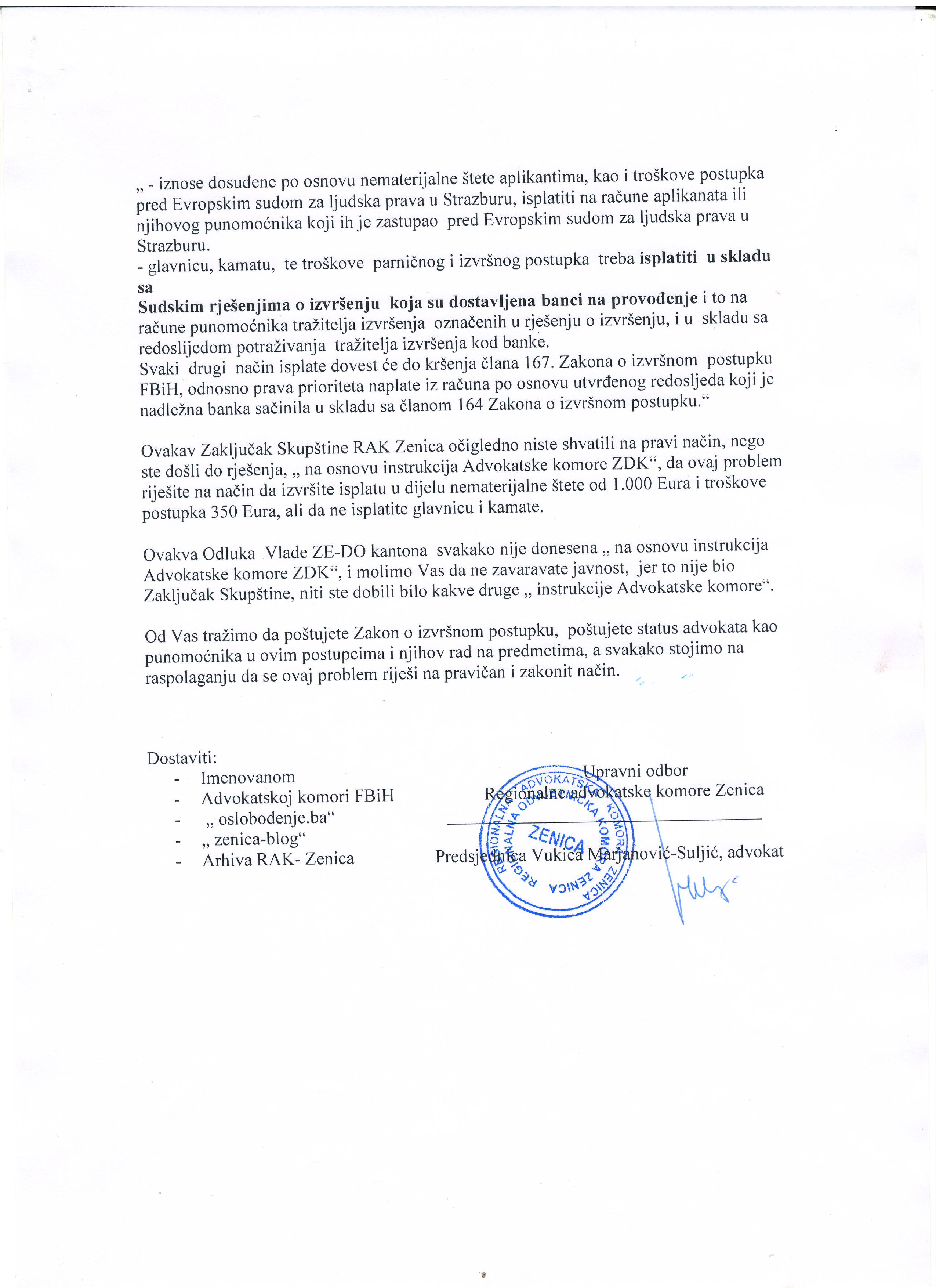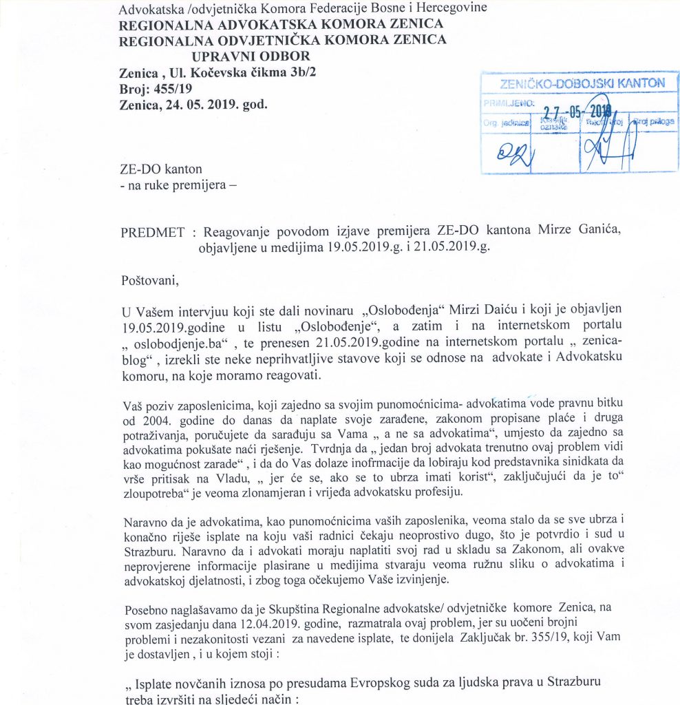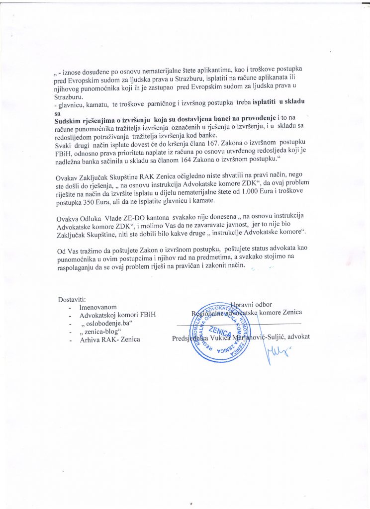 Posebno naglašavamo da je Skupština Regionalne advokatske/ odvjetničke  komore  Zenica, na svom zasjedanju dana 12.04.2019. godine,  razmatrala ovaj problem, jer su uočeni brojni problemi i nezakonitosti vezani  za navedene isplate,  te donijela  Zaključak br. 355/19, koji Vam je dostavljen , i u kojem stoji :