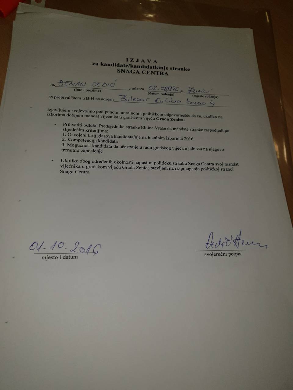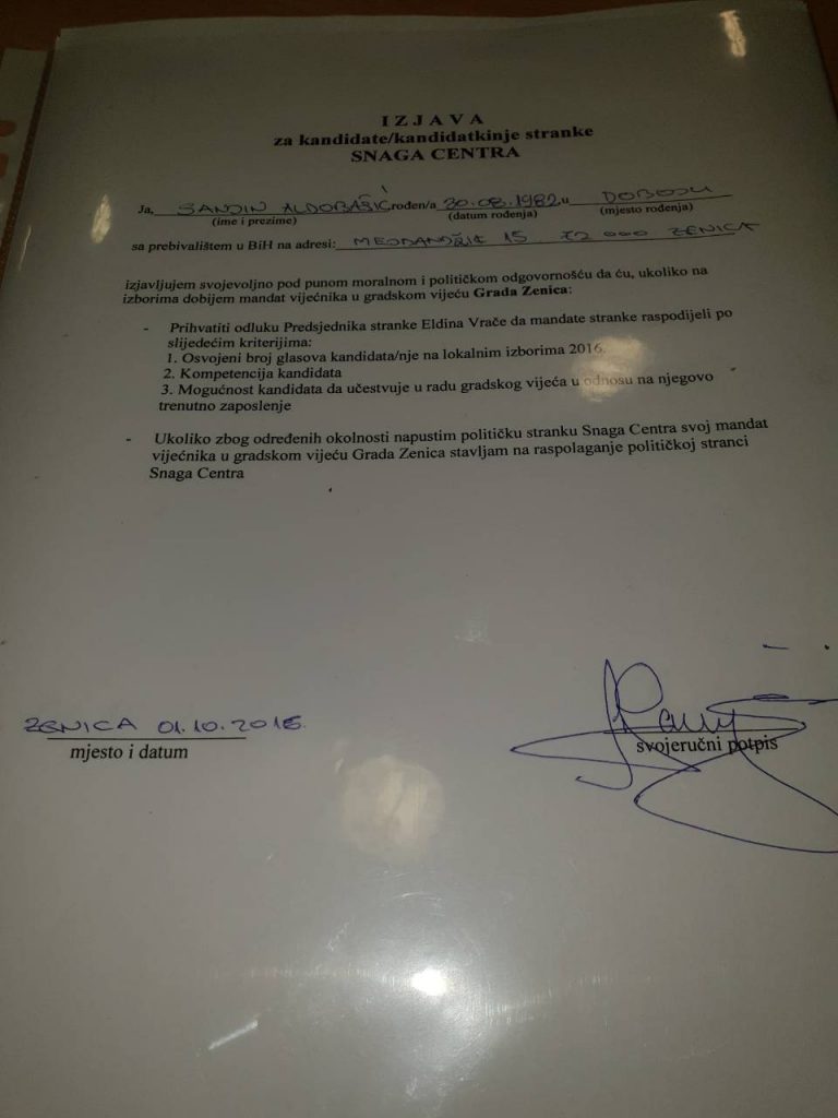 Snaga centra Zenica poziva javno ove takozvane “moralne vertikale” da prestanu pljuvati po svom potpisu i ovjeri, te javnosti dokažu svoju toliko puta rečenu dosljednost – u prilogu ovog Saopćenja iznosimo vlastoručno potpisane i ovjerene izjave kojima su se obavezali da će, ukoliko napuste Snagu centra, vratiti mandat stranci koja ga je i osvojila.