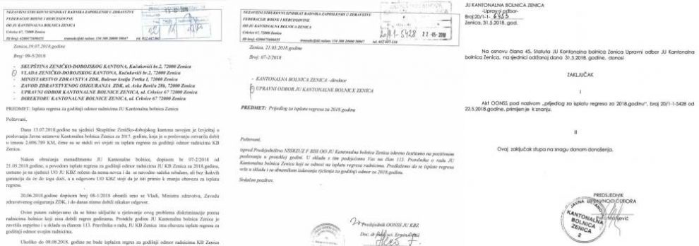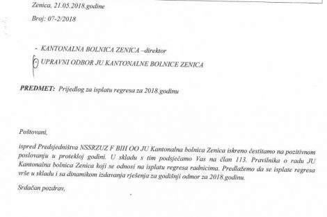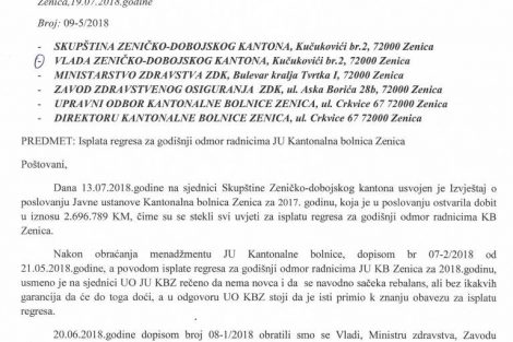 Reakcija sindikata: Za pozitivno poslovanje zaslužni su radnici KBZ – Ne želeći polemizirati sa direktorom JU KBZ Doc dr sc Rasimom Skomorcem, a razumijevajući njegove obveze zbog kojih je zaboravio na naše čestitke i zahtjev za isplatu regresa, dostavljamo vam kopije dokumenata od 21.5.2018. godine (20/1-1-5428. zaprimljen 22.5.2018.) upućenog direktoru i UO JU KBZ čime je otpočela naša borba da radnici KBZ dobiju zarađeni regres nakon više godina.