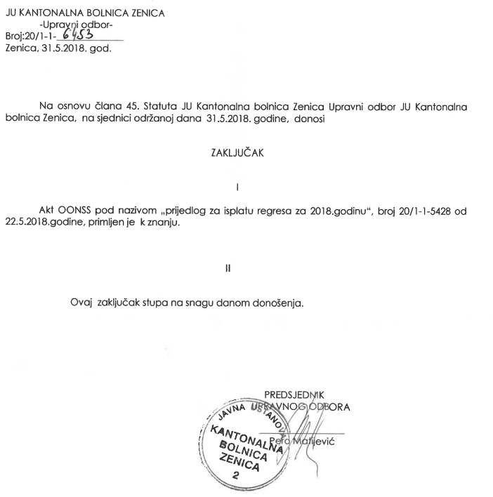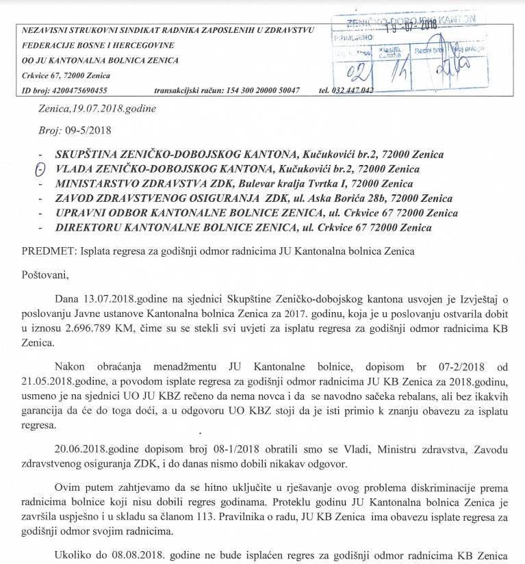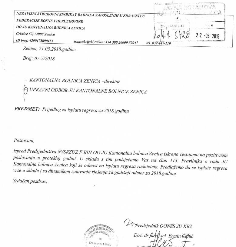 Reakcija sindikata: Za pozitivno poslovanje zaslužni su radnici KBZ – Ne želeći polemizirati sa direktorom JU KBZ Doc dr sc Rasimom Skomorcem, a razumijevajući njegove obveze zbog kojih je zaboravio na naše čestitke i zahtjev za isplatu regresa, dostavljamo vam kopije dokumenata od 21.5.2018. godine (20/1-1-5428. zaprimljen 22.5.2018.) upućenog direktoru i UO JU KBZ čime je otpočela naša borba da radnici KBZ dobiju zarađeni regres nakon više godina.