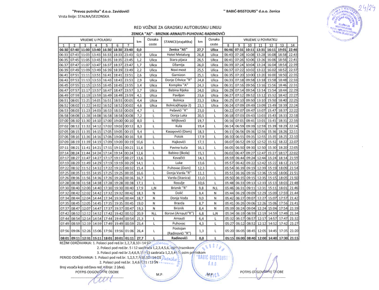 Ovaj dokument također sadrži ovjerene redove vožnje i tabelarni pregled registra redova vožnje koji su dostavljeni u prilogu obavještenja. Cilj je osigurati siguran i efikasan gradski prijevoz za narednih 15 godina, s fokusom na unapređenje životnog standarda građana Zenice i pružanje pouzdane usluge javnog prijevoza.