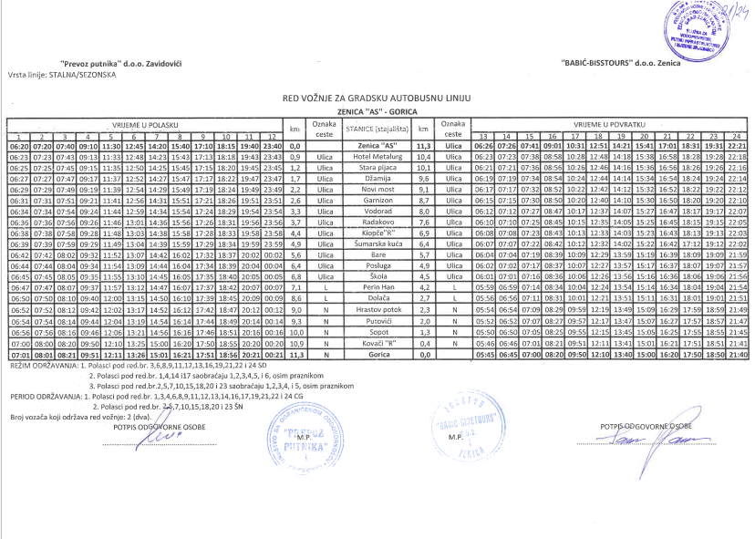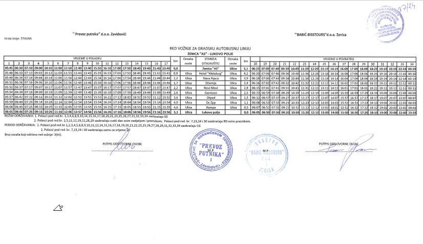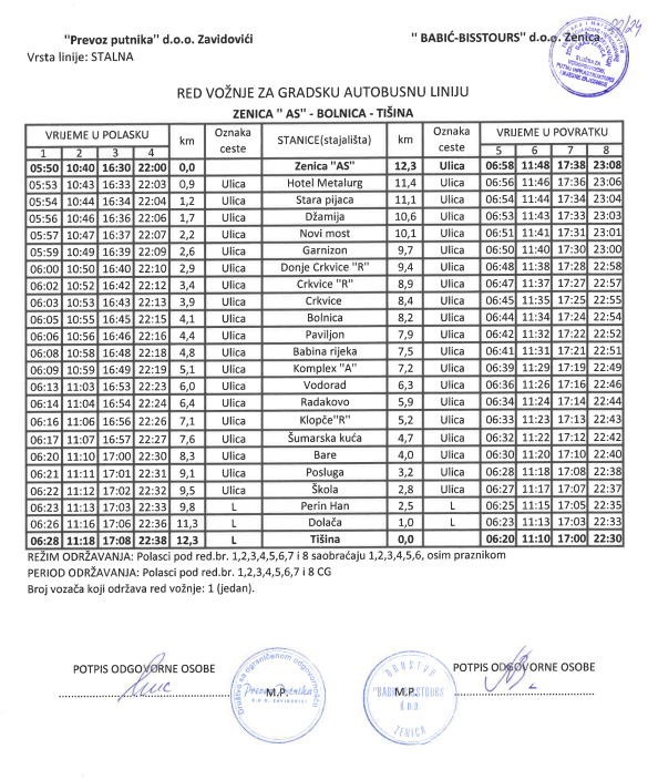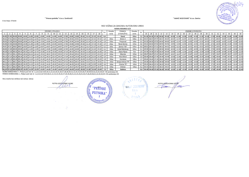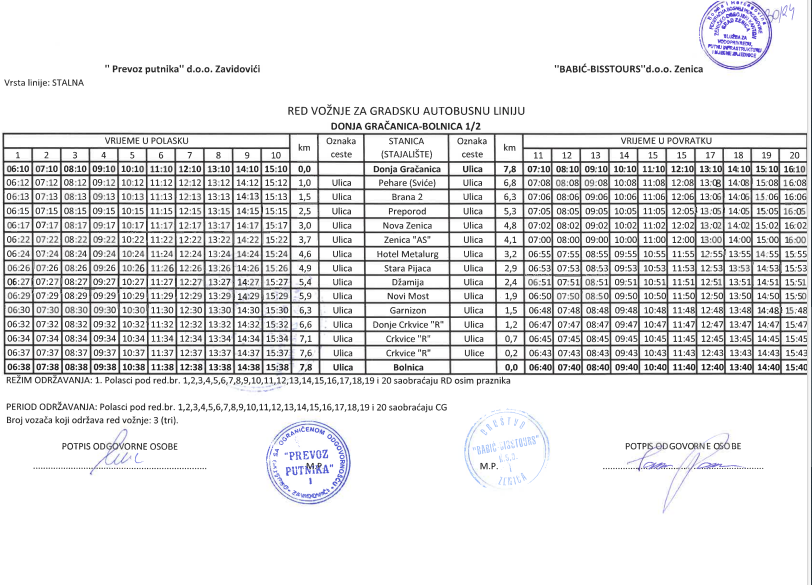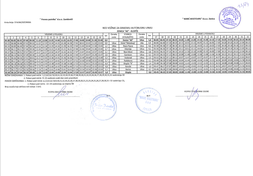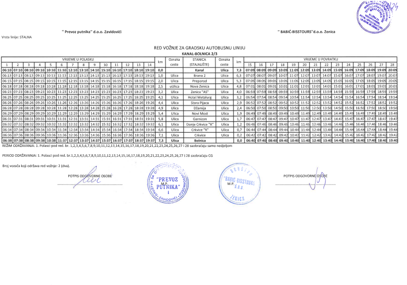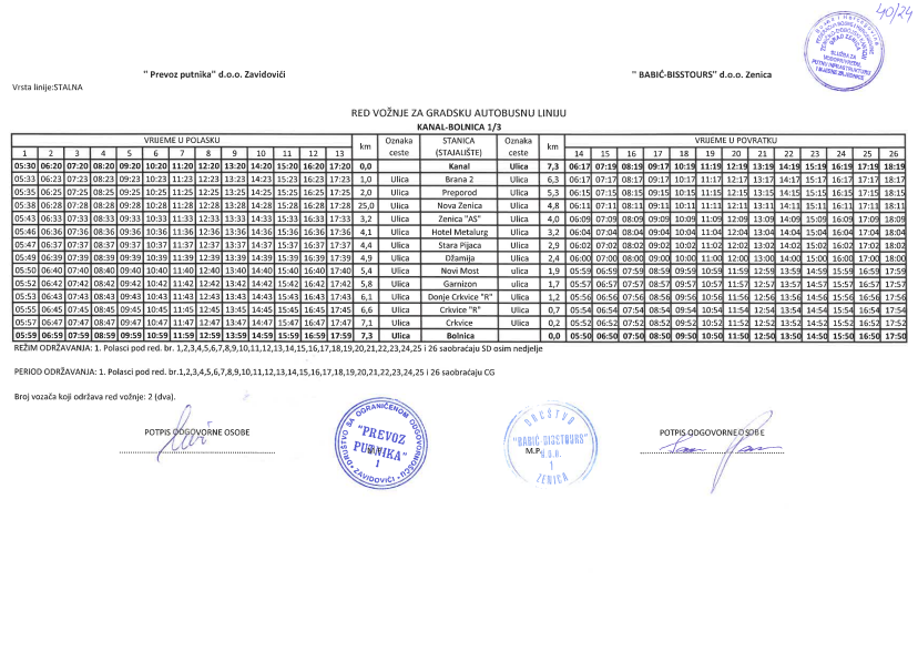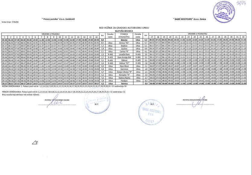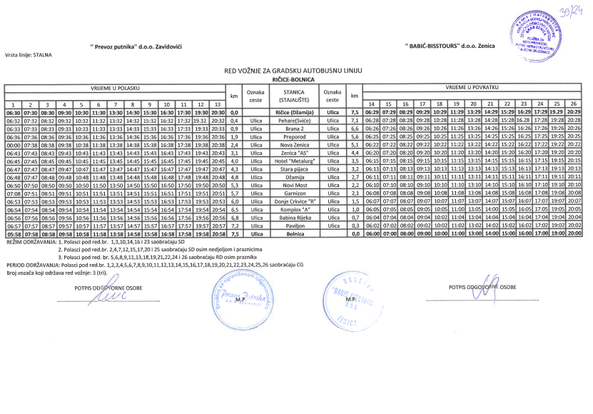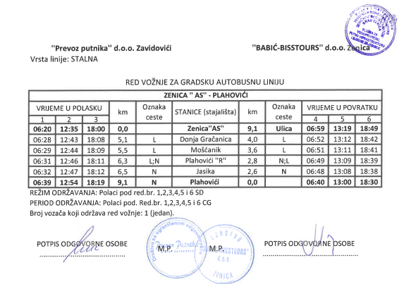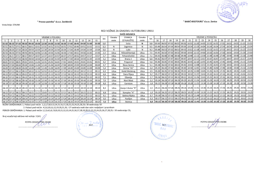 Obavještavamo vas da će od 1. jula 2024. godine stupiti na snagu novi registar redova vožnje za gradski prijevoz u Zenici, u skladu s Ugovorom o povjeravanju obavljanja djelatnosti gradskog prijevoza između Grada Zenica i konzorcija Prevoza putnika d.o.o. Zavidovići – Biss-tours Zenica. Služba za vodoprivredu, putnu infrastrukturu i mjesne zajednice ovjerila je redove vožnje na period od 3 godine, kako je definisano Rješenjem o utvrđivanju Mreže linija gradskog prijevoza.