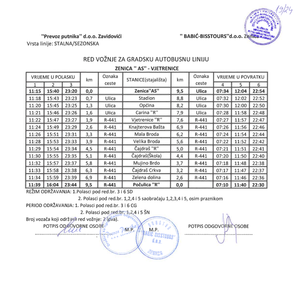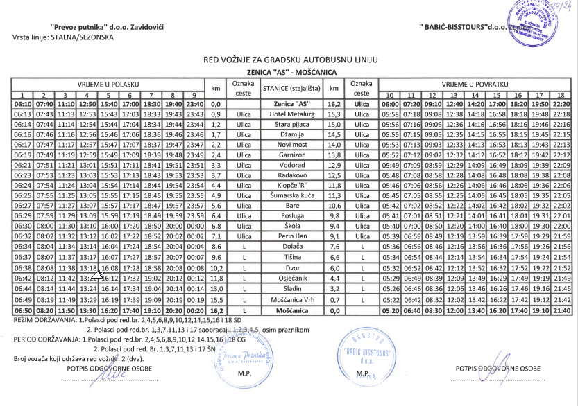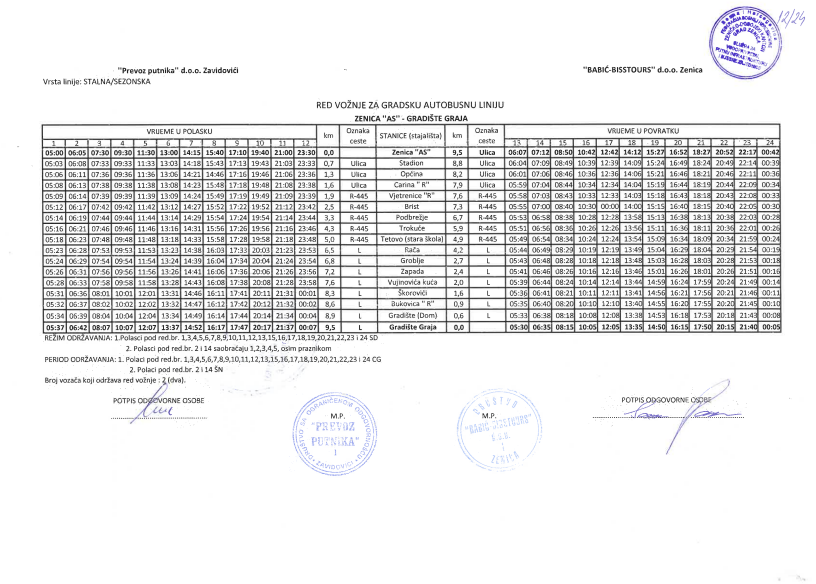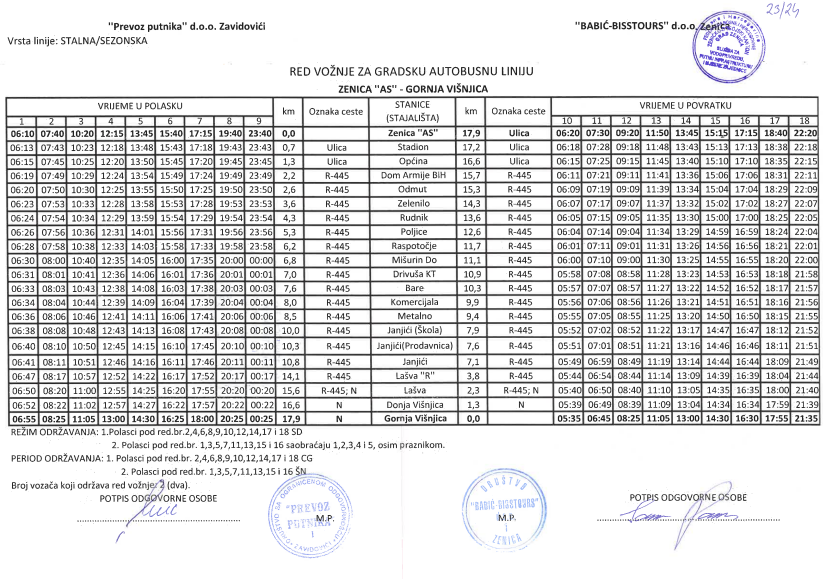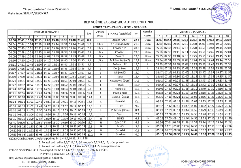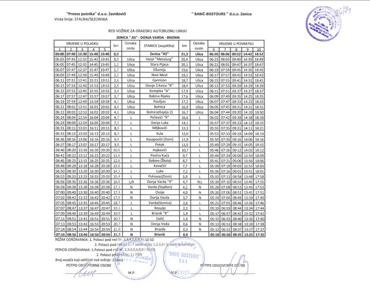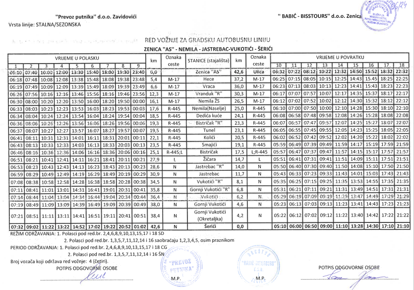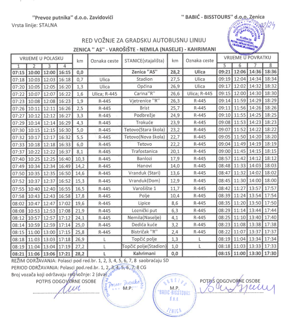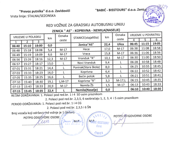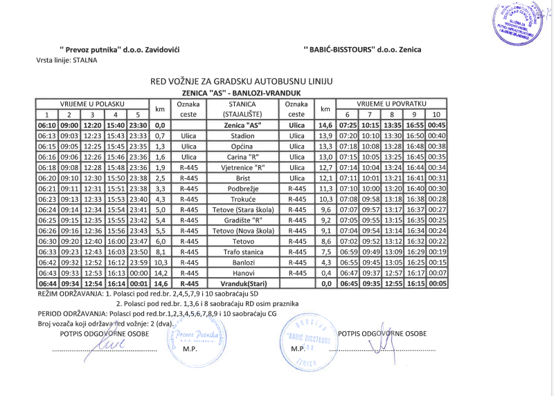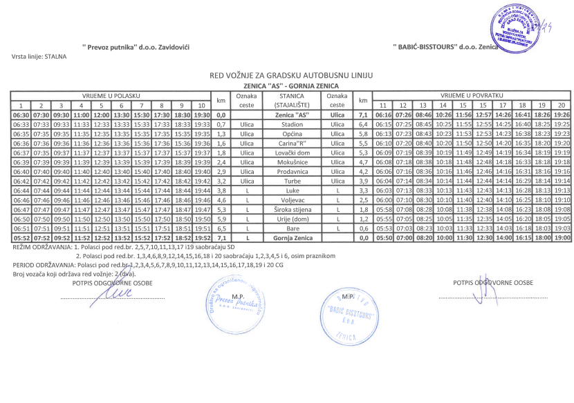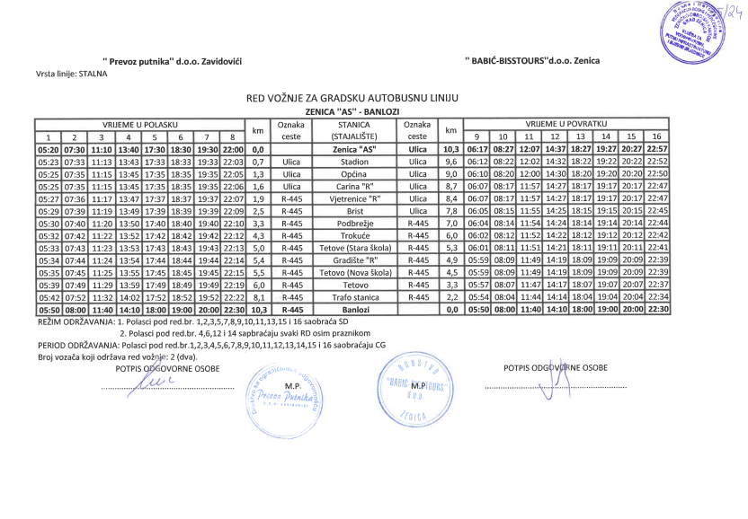 Obavještavamo vas da će od 1. jula 2024. godine stupiti na snagu novi registar redova vožnje za gradski prijevoz u Zenici, u skladu s Ugovorom o povjeravanju obavljanja djelatnosti gradskog prijevoza između Grada Zenica i konzorcija Prevoza putnika d.o.o. Zavidovići – Biss-tours Zenica. Služba za vodoprivredu, putnu infrastrukturu i mjesne zajednice ovjerila je redove vožnje na period od 3 godine, kako je definisano Rješenjem o utvrđivanju Mreže linija gradskog prijevoza.