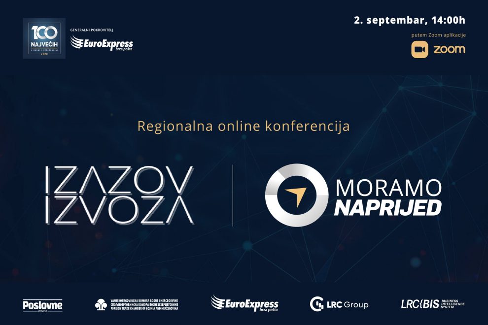 Regionalna online konferencija „Izazov izvoza – Moramo naprijed” početkom septembra – I ove godine u okviru projekta „100 najvećih u BiH“, koji organizuju Poslovne novine iz Sarajeva u suorganizaciji Vanjskotrgovinske/Spoljnotrgovinske komore BiH i LRC-a, uz generalnog pokrovitelja Euroexpress brza pošta, realizovaće treću po redu regionalnu panel konferenciju pod nazivom „Izazov izvoza – Moramo naprijed”. S obzirom na aktuelnu situaciju u vezi sa pandemijom izazvanom koronavirusom, ovogodišnja konferencija će se održati online, 2. septembra u 14:00 sati putem Zoom aplikacije.