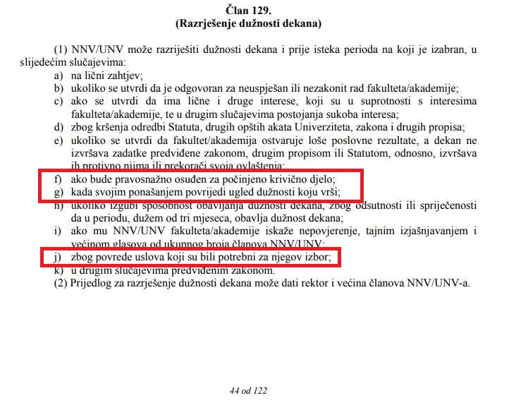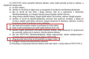 Naime, iako rektor Kukić se u ranijim odgovorima Zenicablogu pozivao na to “da je naložio provjere”, jedan od stavova tog člana kaže da se NNV-u fakulteta može zatražiti smjena dekana “kada svojim ponašanjem povrijedi ugled dužnosti koju vrši”.