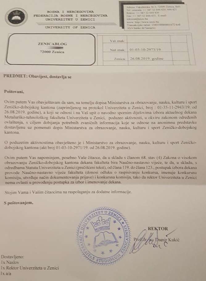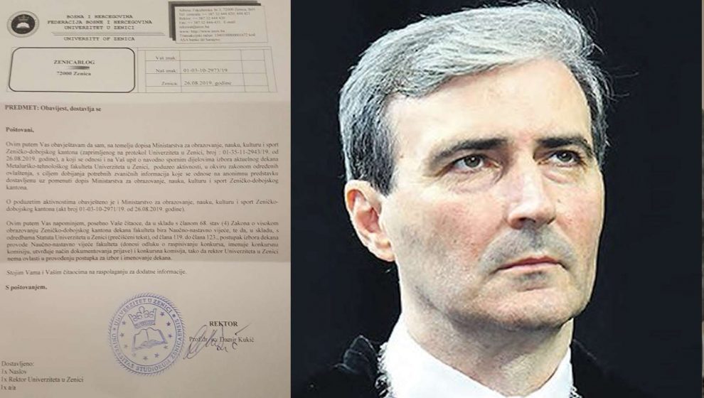 Rektor UNZE Damir Kukić za Zenicablog potvrdio da je poduzeo aktivnosti na provjeri “slučaja Bušatlić” – Rektor Univerziteta Zenica dr. Damir Kukić, potvrdio je u pisanom odgovoru portalu Zenicablog, da je pokrenuo aktivnosti na provjeri podataka koji su objavljeni proteklih dana u vezi sa navodnim neregularnostima prilikom konkursa za dekana Metalurško-tehnološkog fakulteta Univerziteta Zenica (UNZE).