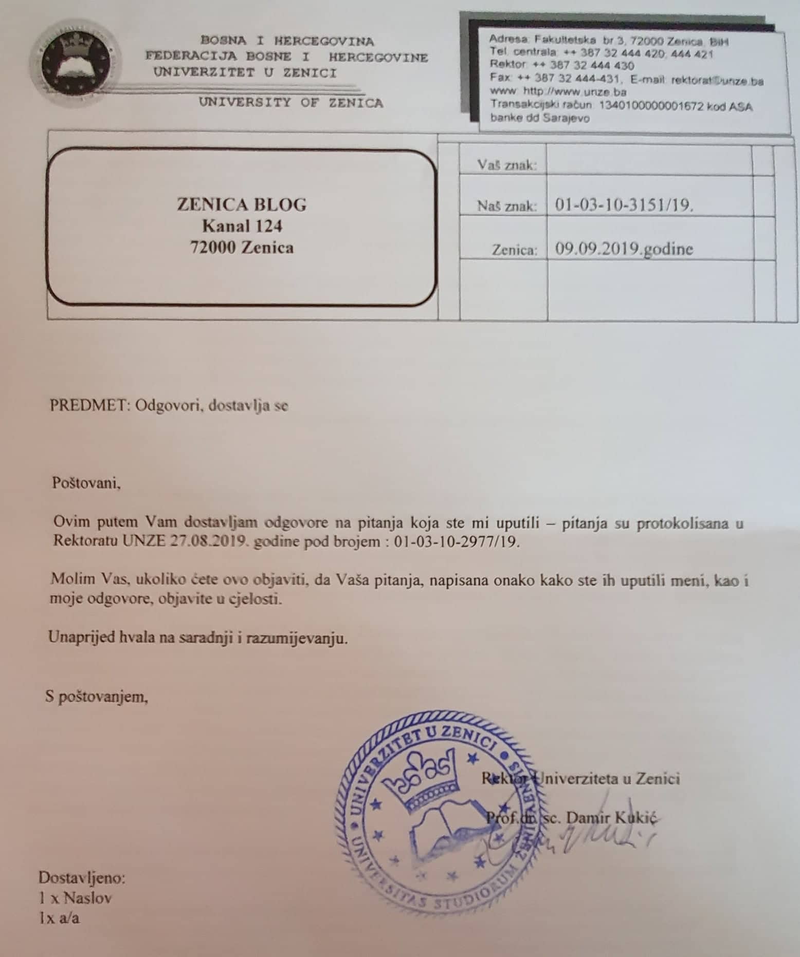 Na protokolu Rektorata Univerziteta u Zenici 26.08.2019. godine protokolisan je akt Ministarstva za obrazovanje, nauku, kulturu i sport Zeničko-dobojskog kantona, pod brojem : 01-35-11-2943/19. Istog dana sam, postupajući prema tom aktu, uputio dopise dekanu Metalurško-tehnološkog fakulteta prof.dr. Ilhanu Bušatliću, zatim Komisiji za sprovođenje konkursne procedure, te predsjedavajućem Naučno-nastavnog vijeća Metalurško-tehnološkog fakulteta s ciljem dobijanja svih potrebnih informacija i očitovanja vezanih za tvrdnje iz anonimne predstavke koja je dostavljena uz pomenuti akt Ministarstva.