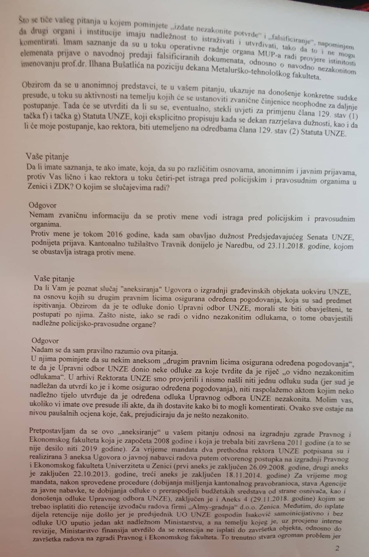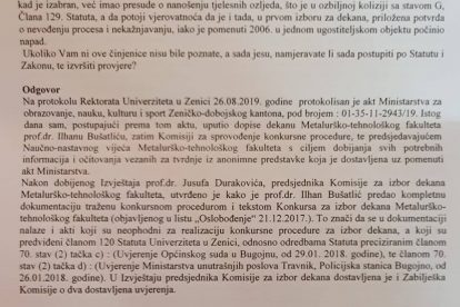 Što se tiče vašeg pitanja u kojem pominjete „izdate nezakonite potvrde“ i „falsificiranje“, napominjem da drugi organi i institucije imaju nadležnost to istraživati i utvrđivati, tako da to i ne mogu komentirati. Imam saznanje da su u toku operativne radnje organa MUP-a radi provjere istinitosti elemenata prijave o navodnoj predaji falsificiranih dokumenata, odnosno o navodno nezakonitom imenovanju prof.dr. Ilhana Bušatlića na poziciju dekana Metalurško-tehnološkog fakulteta.