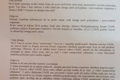 Da li Vam je poznat slučaj “aneksiranja” Ugovora o izgradnji građevinskih objekata uokviru UNZE, na osnovu kojih su drugim pravnim licima osigurana određena pogodovanja, koja su sad predmet ispitivanja. Obzirom da je te odluke donio Upravni odbor UNZE, morali ste biti obavješteni, te postupati po njima. Zašto niste, iako se radi o vidno nezakonitim odlukama, o tome obavjestili nadležne policijsko-pravosudne organe?