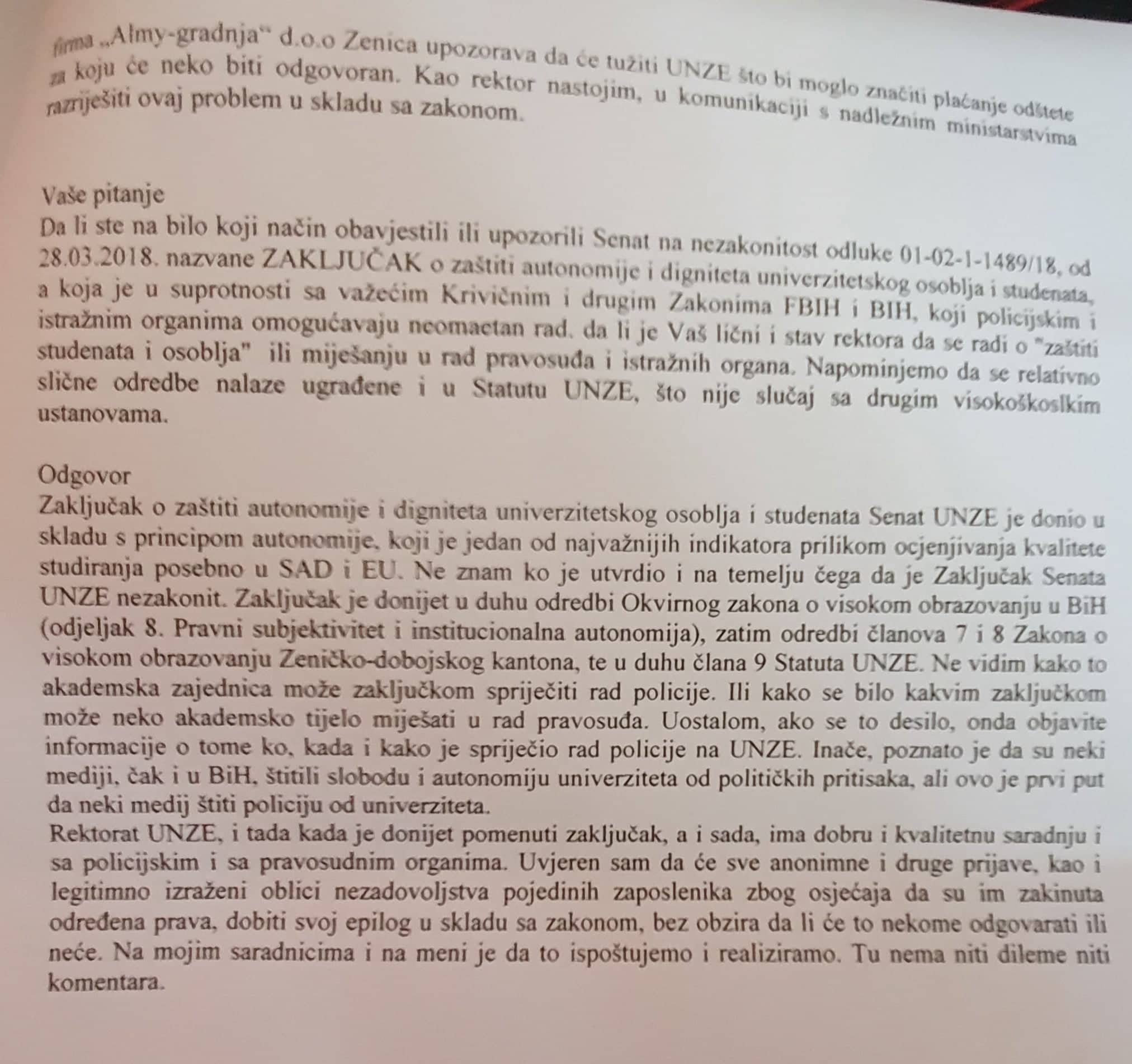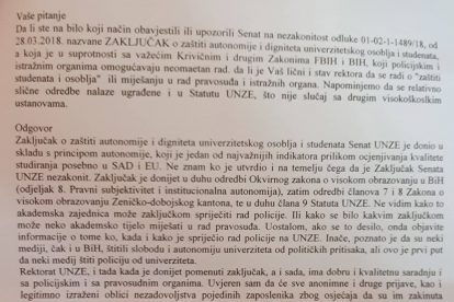Zaključak o zaštiti autonomije i digniteta univerzitetskog osoblja i studenata Senat UNZE je donio u skladu s principom autonomije, koji je jedan od najvažnijih indikatora prilikom ocjenjivanja kvalitete studiranja posebno u SAD i EU. Ne znam ko je utvrdio i na temelju čega da je Zaključak Senata UNZE nezakonit. Zaključak je donijet u duhu odredbi Okvirnog zakona o visokom obrazovanju u BiH (odjeljak 8. Pravni subjektivitet i institucionalna autonomija), zatim odredbi članova 7 i 8 Zakona o visokom obrazovanju Zeničko-dobojskog kantona, te u duhu člana 9 Statuta UNZE. Ne vidim kako to akademska zajednica može zaključkom spriječiti rad policije. Ili kako se bilo kakvim zaključkom može neko akademsko tijelo miješati u rad pravosuđa. Uostalom, ako se to desilo, onda objavite informacije o tome ko, kada i kako je spriječio rad policije na UNZE. Inače, poznato je da su neki mediji, čak i u BiH, štitili slobodu i autonomiju univerziteta od političkih pritisaka, ali ovo je prvi put da neki medij štiti policiju od univerziteta.