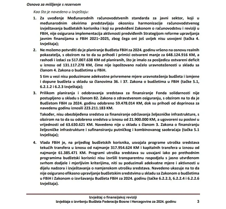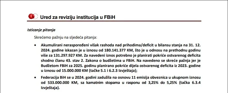 Suština izvještaja je da je Federacija Bosne i Hercegovine 2024. godinu završila sa budžetskim deficitom od 180 miliona maraka. U odnosu na godinu ranije deficit je veći za čak 130 miliona maraka.