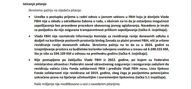 U izvještaju se, između ostalog, navodi i da prilikom planiranja i odobravanja sredstava za finansiranje Fonda solidarnosti nije postupljeno u skladu s članom 82. Zakona o zdravstvenom osiguranju, s obzirom na to da je Budžetom FBiH za 2024. godinu odobreno 59.478.014 KM, dok su prihodi od doprinosa za navedenu godinu iznosili 223.211.183 KM.