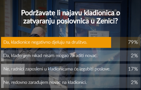 Rezultati ankete pokazuju da čak 79 posto čitaoca podržava odlazak kladionica iz Zenice zbog negativnog djelovanja kladionica na društvo. S druge strane, 2 posto čitaoca podržava povlačenje kladionica jer u njima nisu mogli zaraditi novac i bili su stalno “u minusu“.