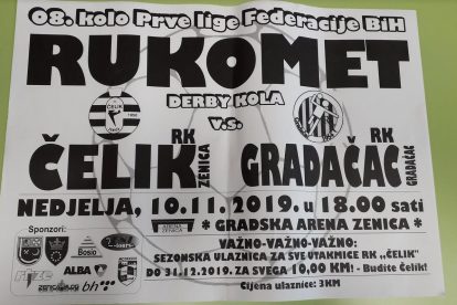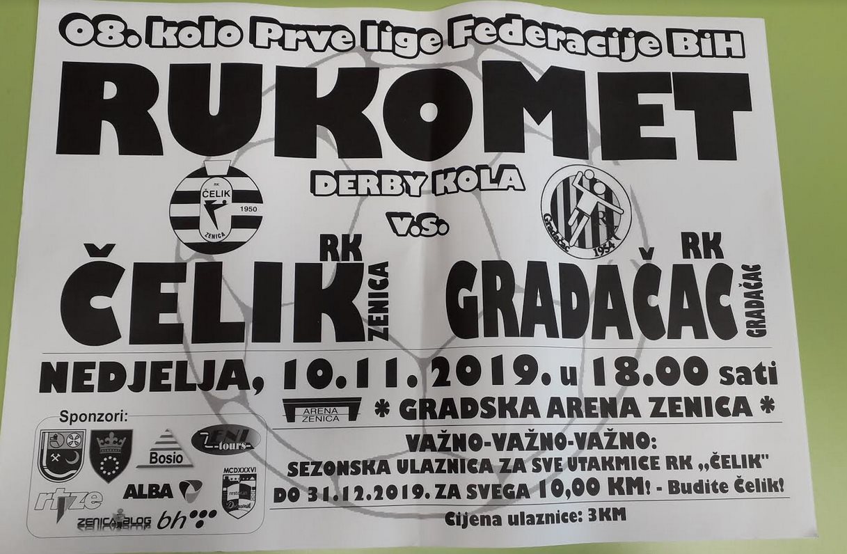 Utakmica RK Čelik – RK Gradačac igra se u nedjelju 10.11. 2019.godine u gradskoj Areni „Husejin Smajlović“ u Zenici, centralni teren, sa početkom u 18 sati. Cijena karte je 3 KM.