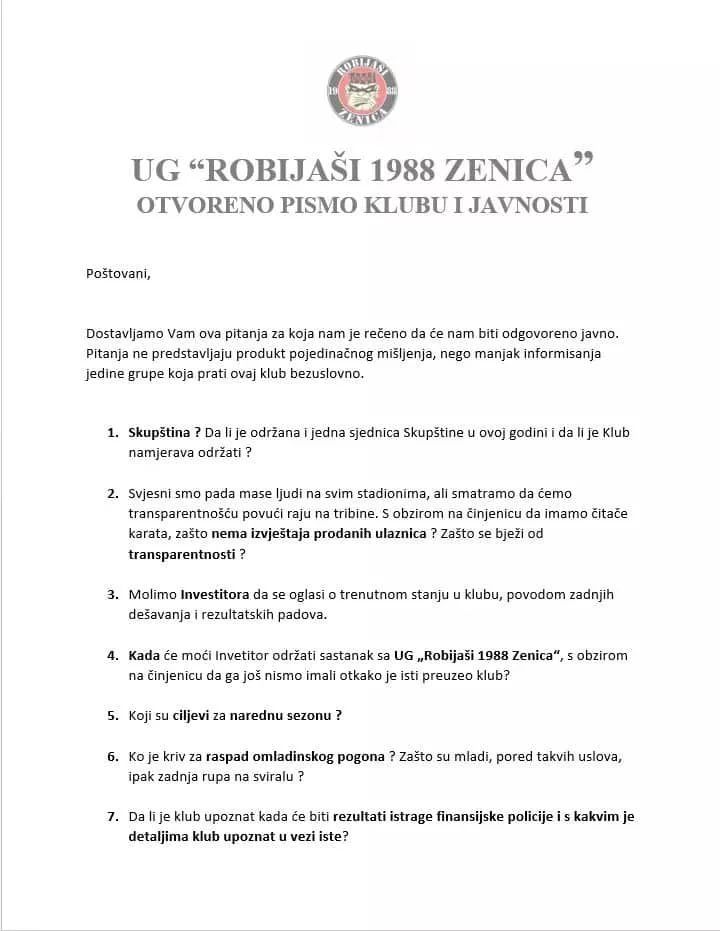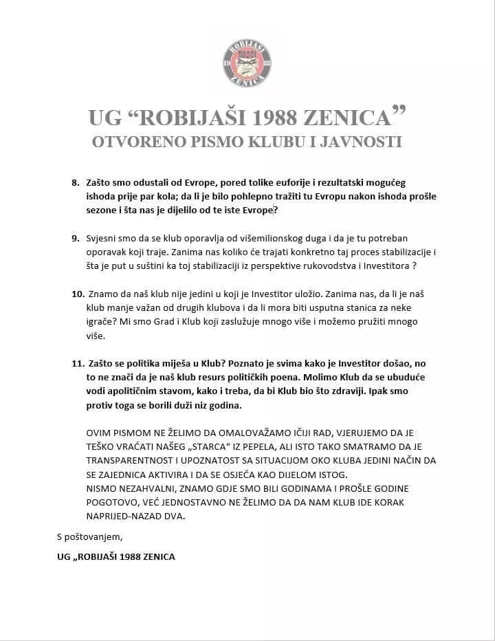 Shvatili su to i navijači, popularni Robjaši 1988 Zenica, koji su odlučili uputiti otvoreno pismo klubu i javnosti.