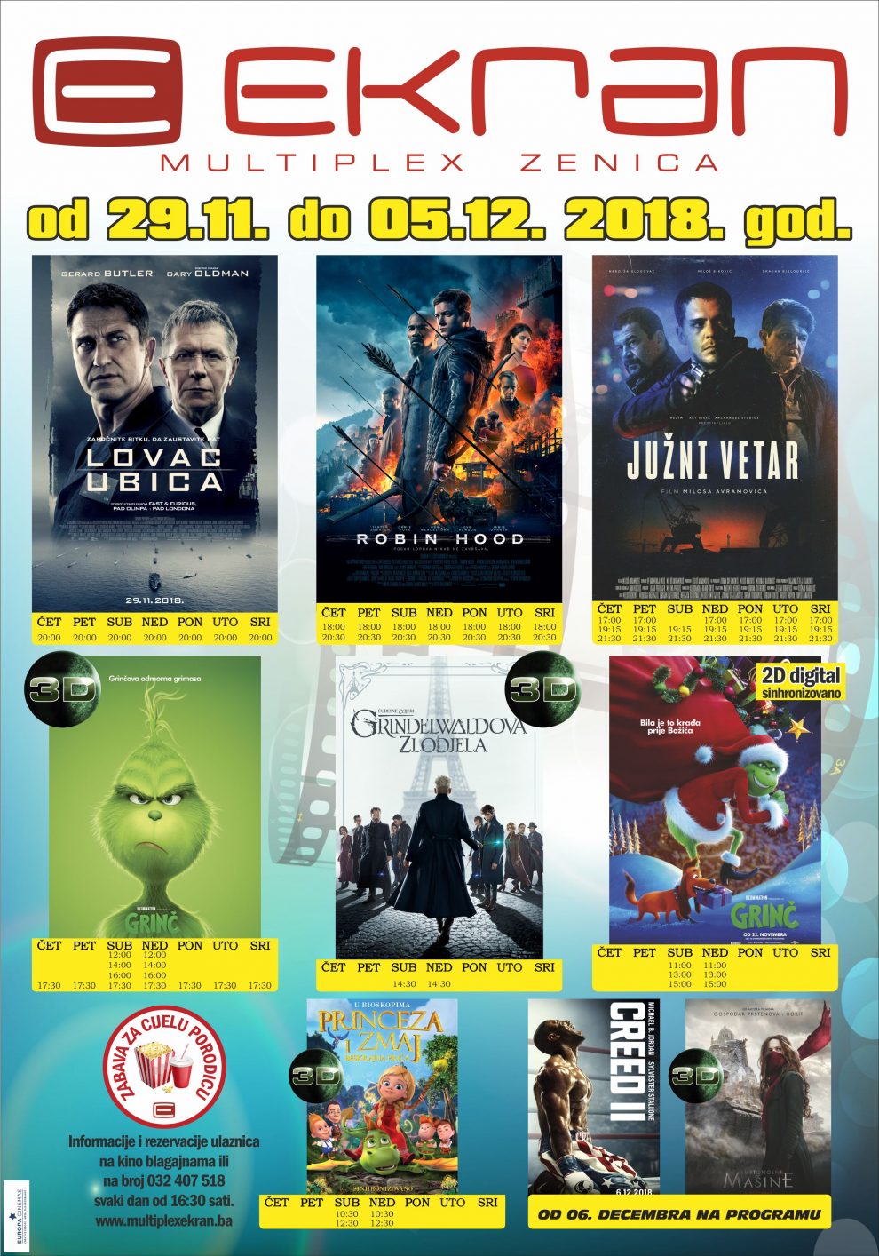 „Robin Hood“, „Lovac ubica“ i „Princeza i zmaj 3D“ od 29. novembra na programu Multiplexa „Ekran“ Zenica, nastavlja se i prikazivanje najgledanijeg filma u regionu „Južni vetar“ – Od 29. novembra publiku u Multiplexu „Ekran“ Zenica očekuju tri nova filma, ali i nastavak prikazivanja najgledanijeg filma u regionu „Južni vetar“. Nova verzija Robina Hooda će prikazati mlade dane poznatog pljačkaša i otkriti detalje koji su Robina (Egerton) potakli da se izvan zakona bori za malog čovjeka. Hunter Killer (Lovac ubica) je nadolazeći američki akcijski film sa Gerardom Butlerem u glavnoj ulozi. Režiju potpisuje Donovan Marsh, a scenarij Arne Schmidt i Jamie Moss. U animiranoj avanturi upoznajemo princezu Sofiju koja luta kroz tajne odaje dvorca i pronalazi čarobnu knjigu koja je vodi u čudesnu zemlju. Ova animirana avantura je itekako zanimljiva za cijelu porodicu jer se prikazuje u subotu i nedjelju od 10:30 i 12:30 sati.