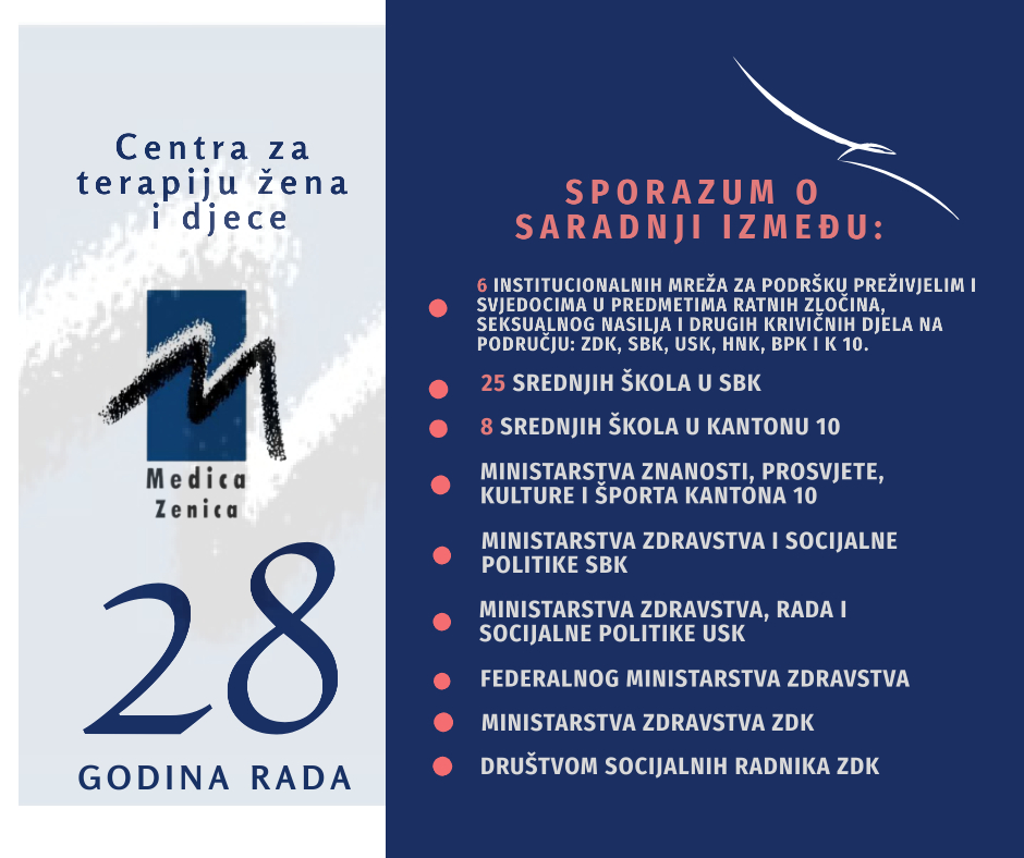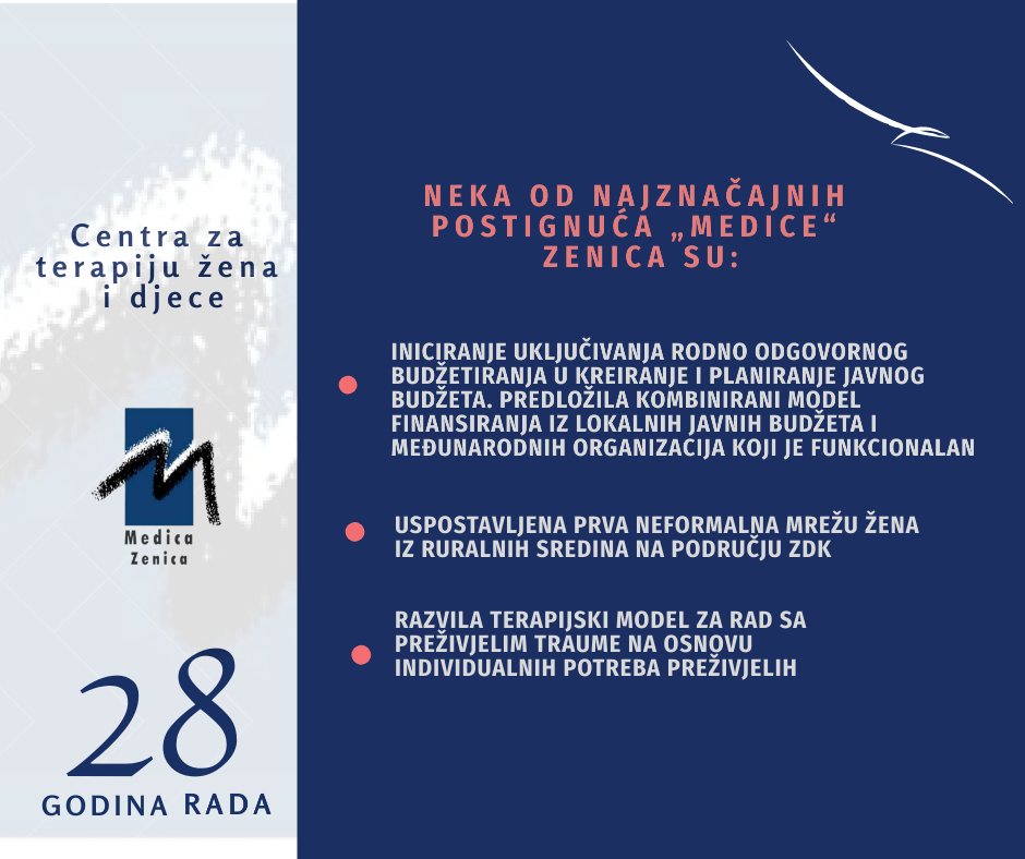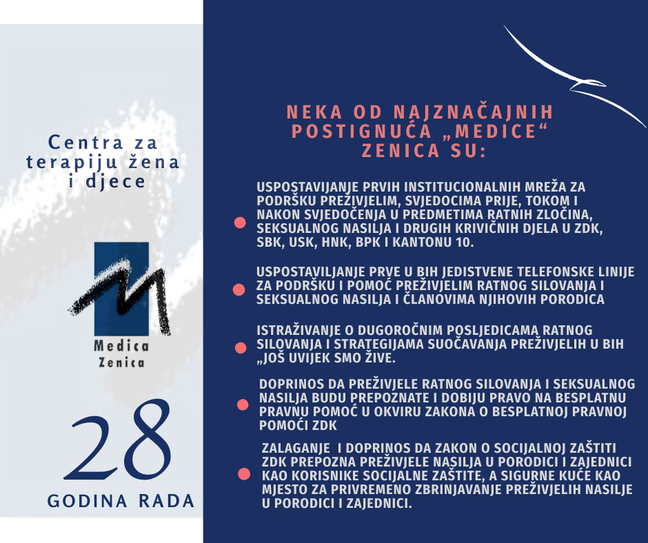 Danas je “Medica” Zenica specijalizirana ženska organizacija koja je uspostavila prve institucionalne mreže za podršku preživjelim, svjedocima prije, tokom i nakon svjedočenja u predmetima ratnih zločina, seksualnog nasilja i drugih krivičnih djela u ZDK, SBK, USK, HNK, BPK i Kantonu 10. Doprinijela je mnogim zakonskim rješenjima, i pružila je preko 570 hiljada usluga širom BiH i još uvijek nastoji odgovoriti na potrebe najranjivijih kategorija u društvu, žene i djeca preživjeli ratno silovanje i seksualno nasilje, mirnodopsko silovanje i ostale oblike nasilja u porodici i zajednici, kao i preživjele trgovinu ljudima. Uspostavila je i prve u BiH jedistvene telefonske linije za podršku i pomoć preživjelim ratnog silovanja i seksualnog nasilja i članovima njihovih porodica. “Medica” je uspostavila i mnogobrojne međunarodne i lokalne mreže, potpisala sporazume i memorandume.